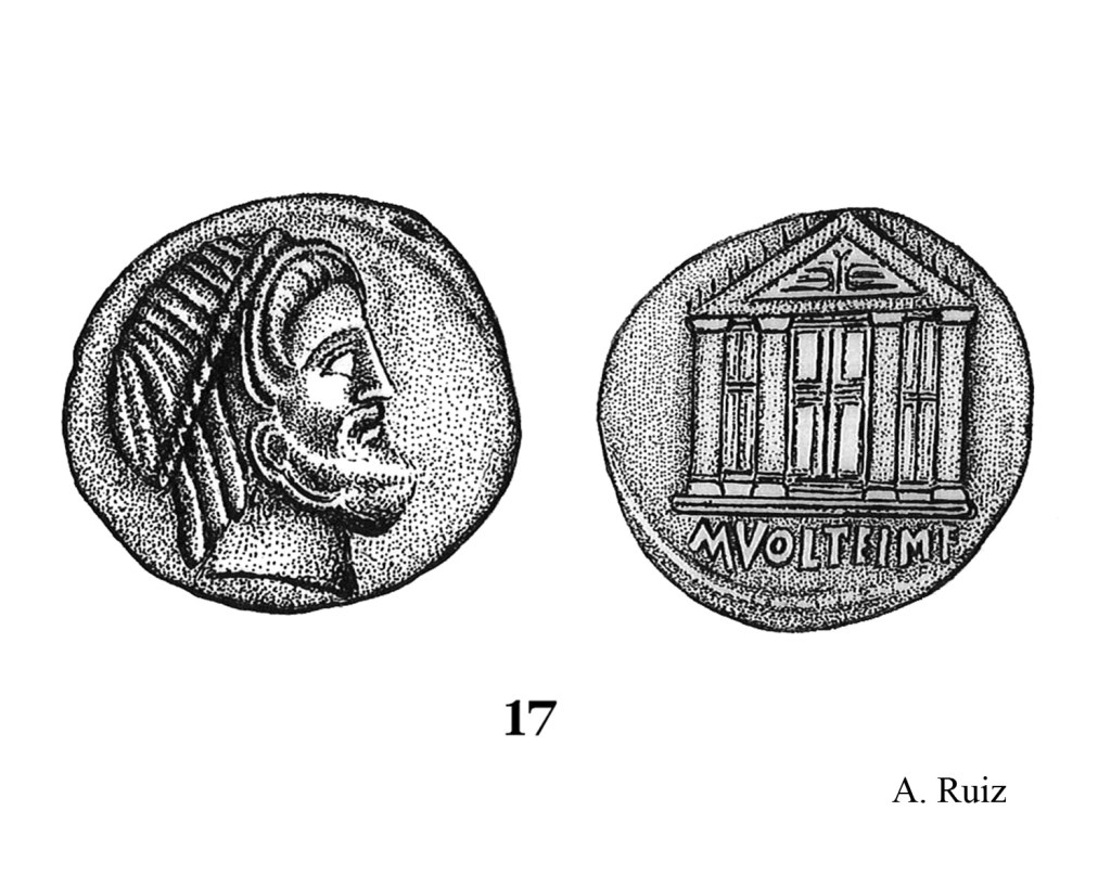 Esta moneda fue acuñada por esta familia en el año 80 a. de C. El templo en ella representado es el de Júpiter Capitolino, tetrástilo, con tres puertas y la imagen de las tres divinidades capitolinas. Se piensa que este templo representa al antiguo, dedicado por Marco Horacio Pulvio en el año 509 a. de C., en honor de Júpiter Capitolino.