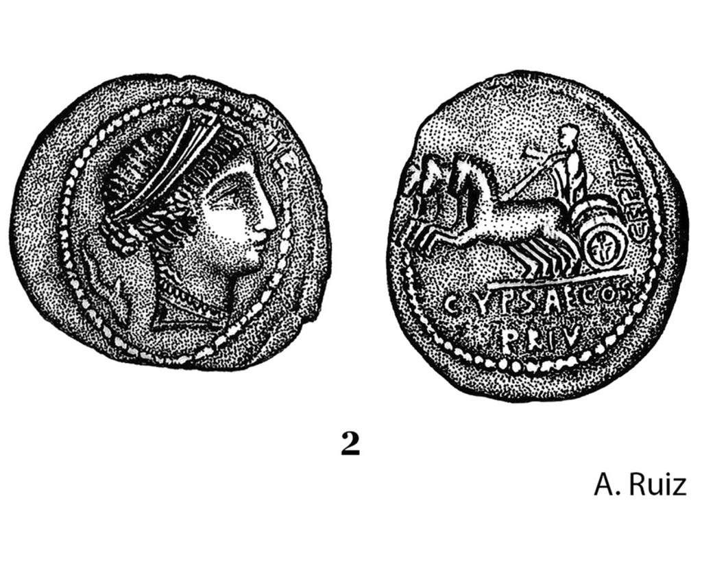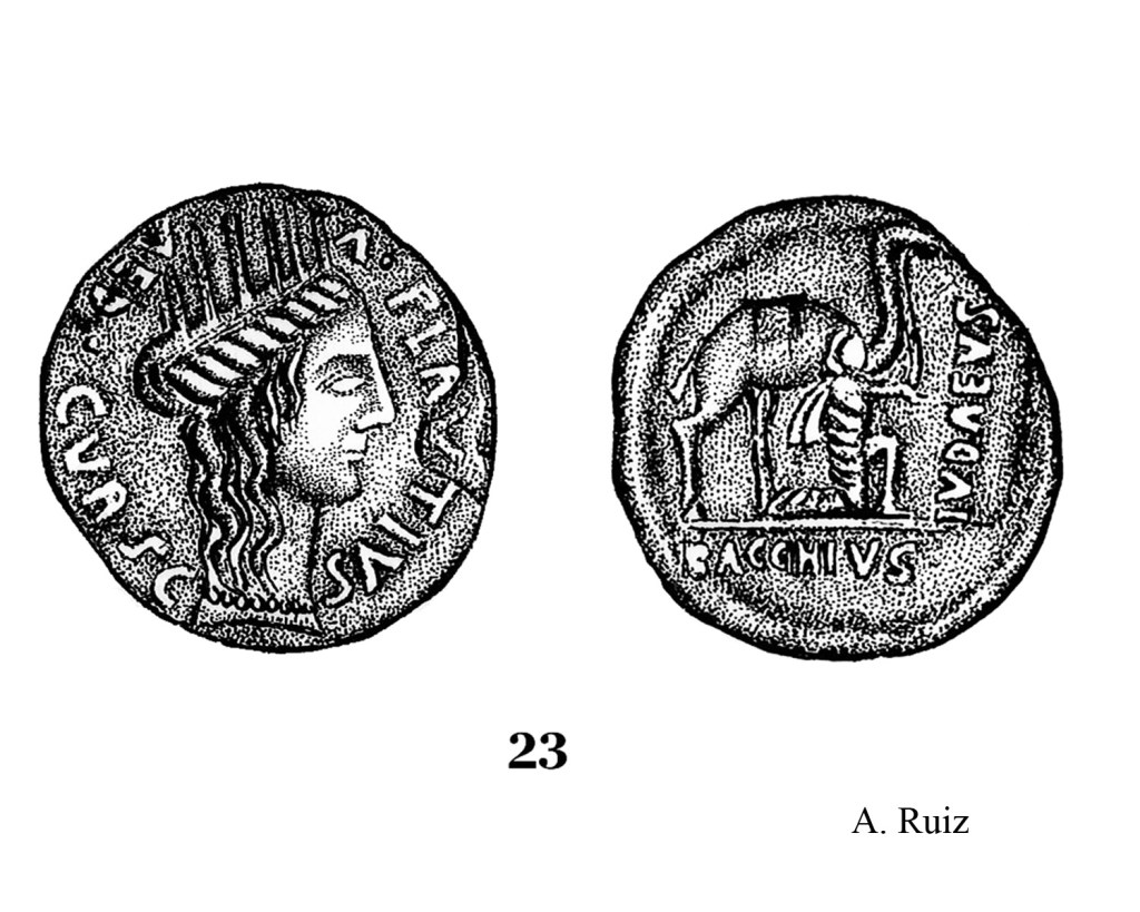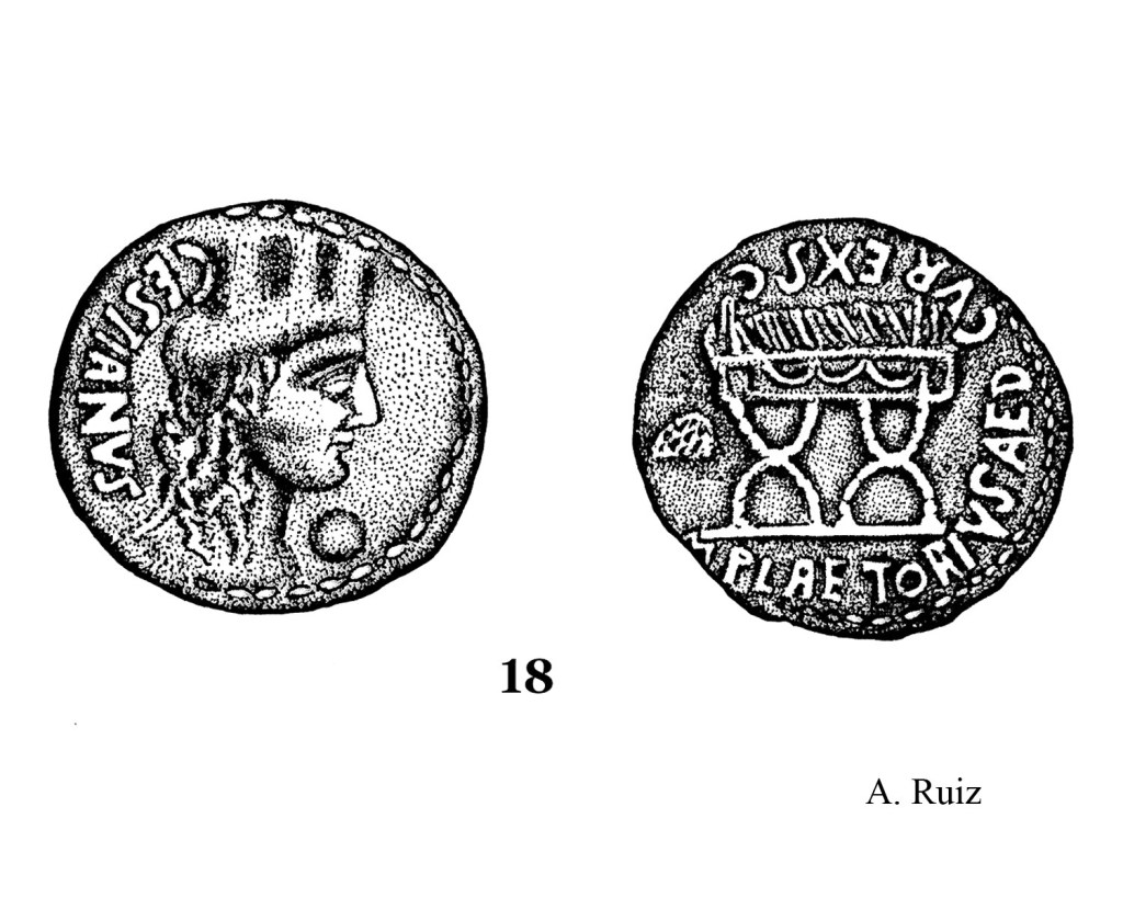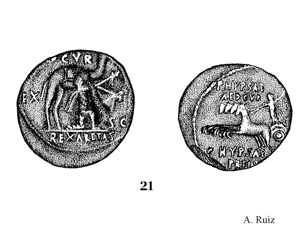 En la moneda nº 21 se nos presenta a un personaje desconocido, Baquio, en la misma situación que el rey Aretas. En ella se recuerda la gloria del cónsul Gayo Plautio HYPSAEVS. La cabeza de Cibeles hace referencia a los Juegos Megalenses que ordenaban los ediles curules.