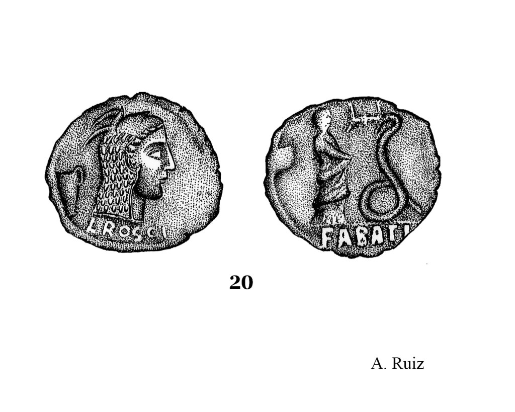 La moneda nº 24 fue acuñada por el pretor LVCIVS ROSCIVS FABATVS. La cabeza de Juno Sóspita o Lanuviana, indica que Roscio era oriundo de Lanuvio, y no de Lavinio.