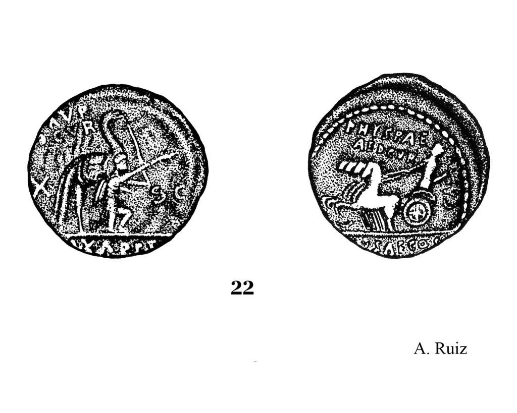 La moneda nº 22 se atribuye al triunviro y monetario Gayo Pobliceo Maleolo, que fue cuestor con Dolabella en Cilicia.
