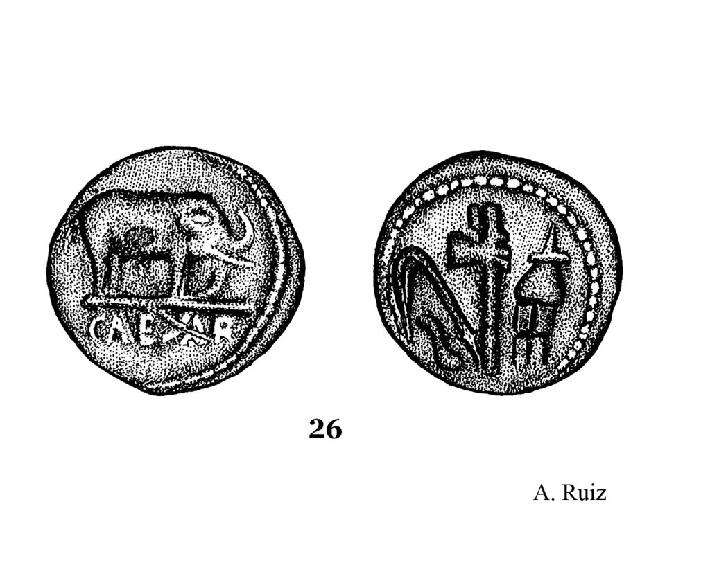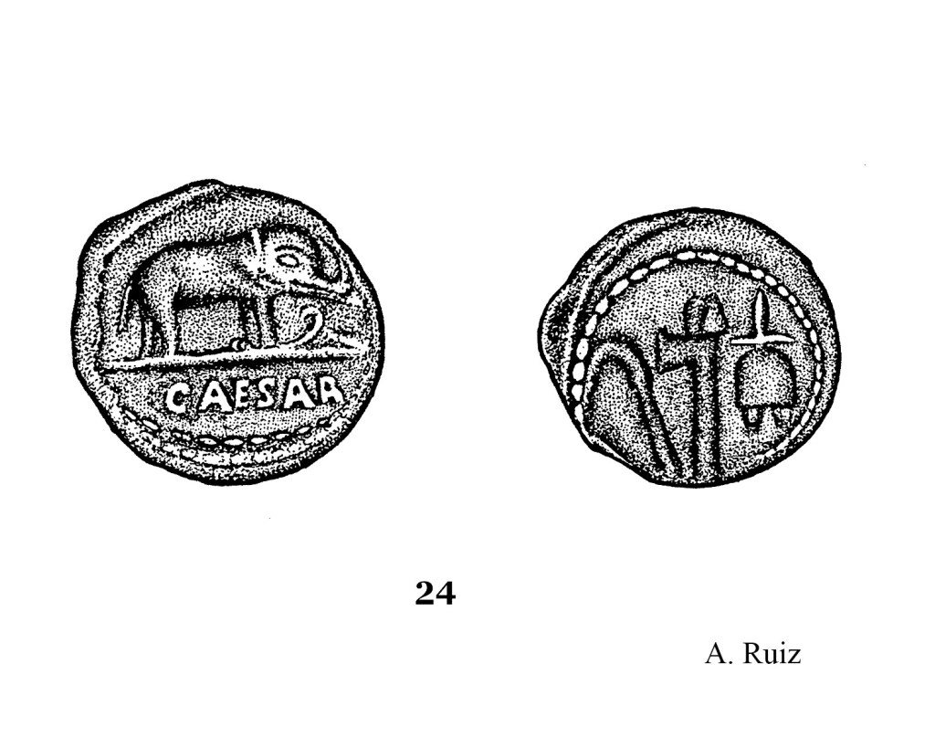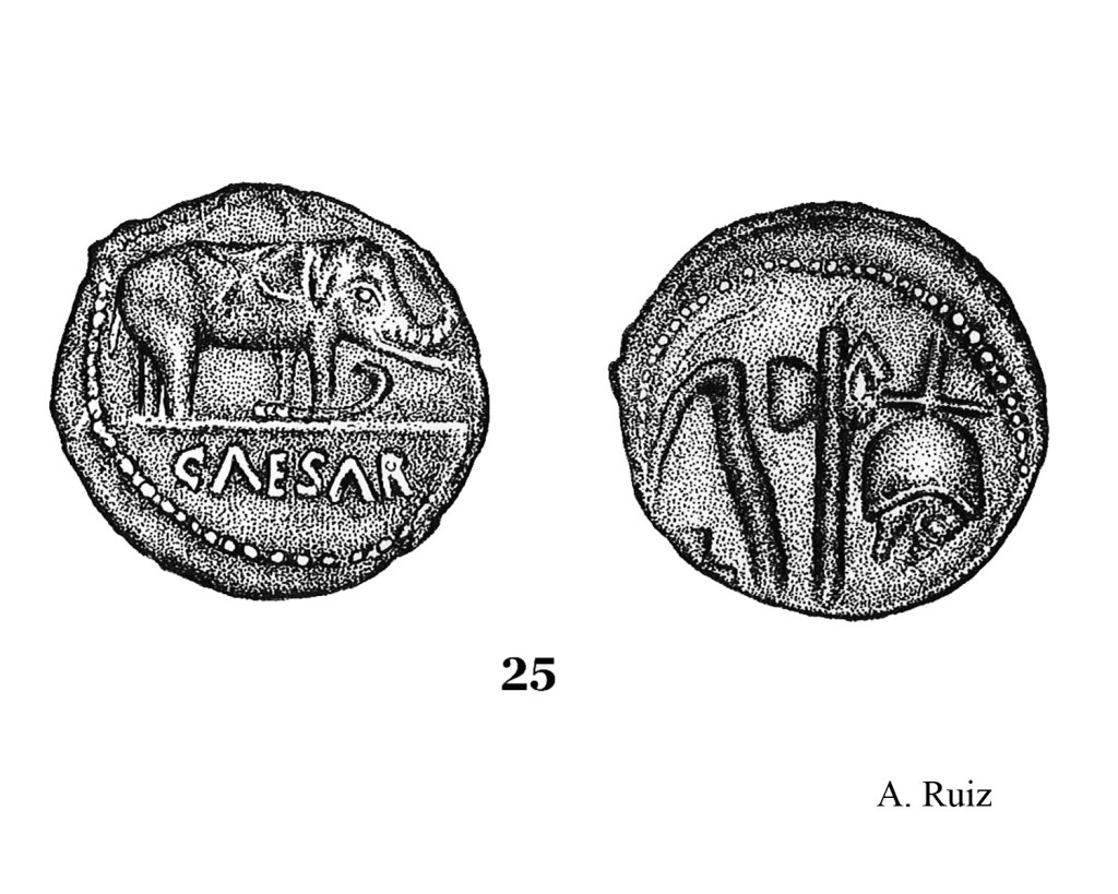 Las monedas nº 24, 25 y 26 muestran en sus anversos la figura de un elefante pisando a una serpiente. Se dice que César, cuyo nombre por similitud fonética con la lengua fenicia, significa elefante, imprimió esta imagen para significar sus victorias sobre los enemigos.