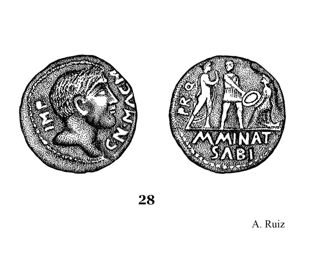 La moneda nº 17 fue acuñada por Marco Minatio Sabino un año antes de la derrota y muerte del hijo de Pompeyo, procuestor en Hispania. El anverso representa a Pompeyo padre. El reverso presenta la Bética acogiendo a Pompeyo, ofreciéndole apoyo y proporcionándole armas para continuar la guerra contra César, quien antes había derrotado y aniquilado en África a Escipión y a sus seguidores.