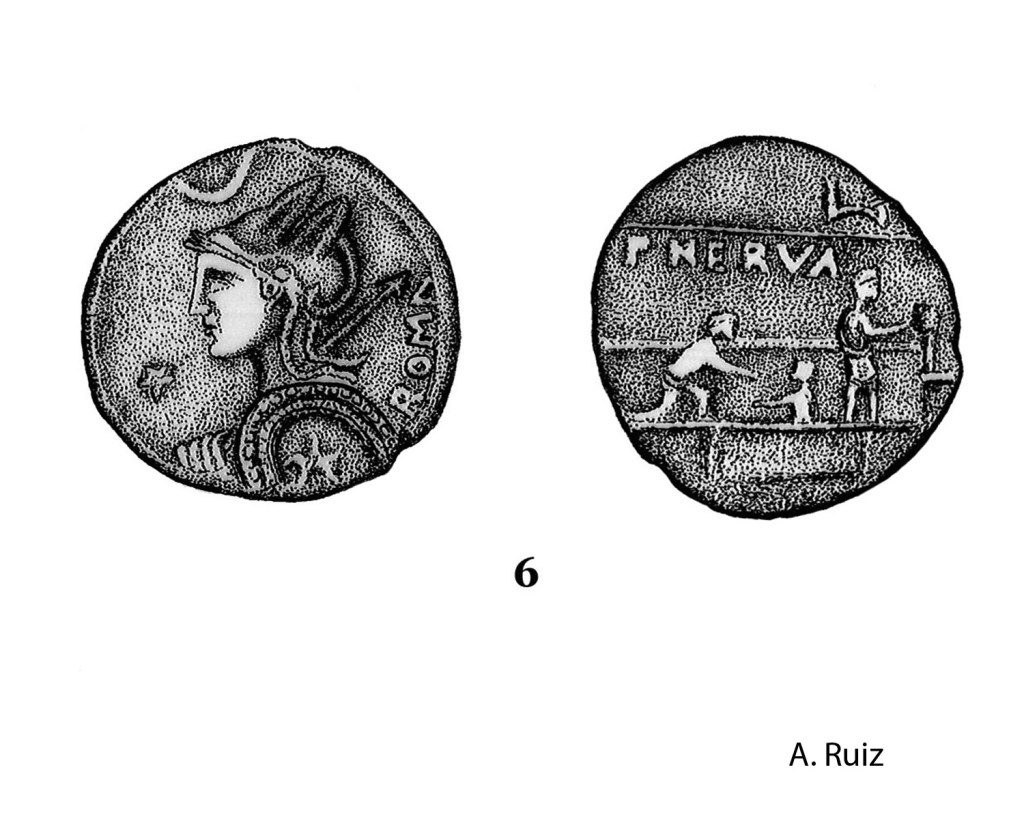 La moneda nº 5 fue acuñada por Quinto Antonio Balbo, pretor de Mario en la Hispania durante la Guerra Civil entre él y Sula.
