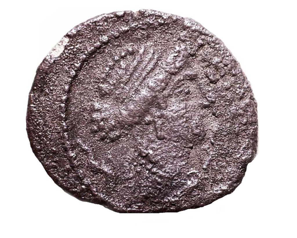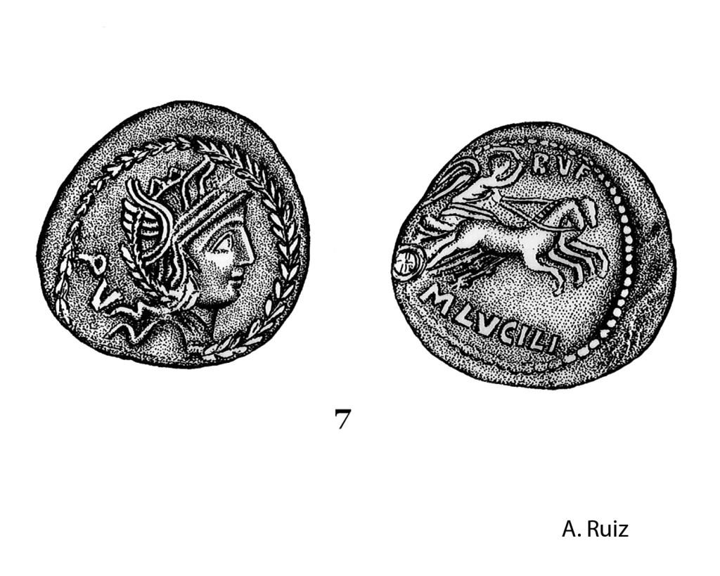 Moneda acuñada hacia el 94 a. de C. por Marco Lucilio Rufo, cuestor o monetario en esa época y tribuno de la plebe años después.