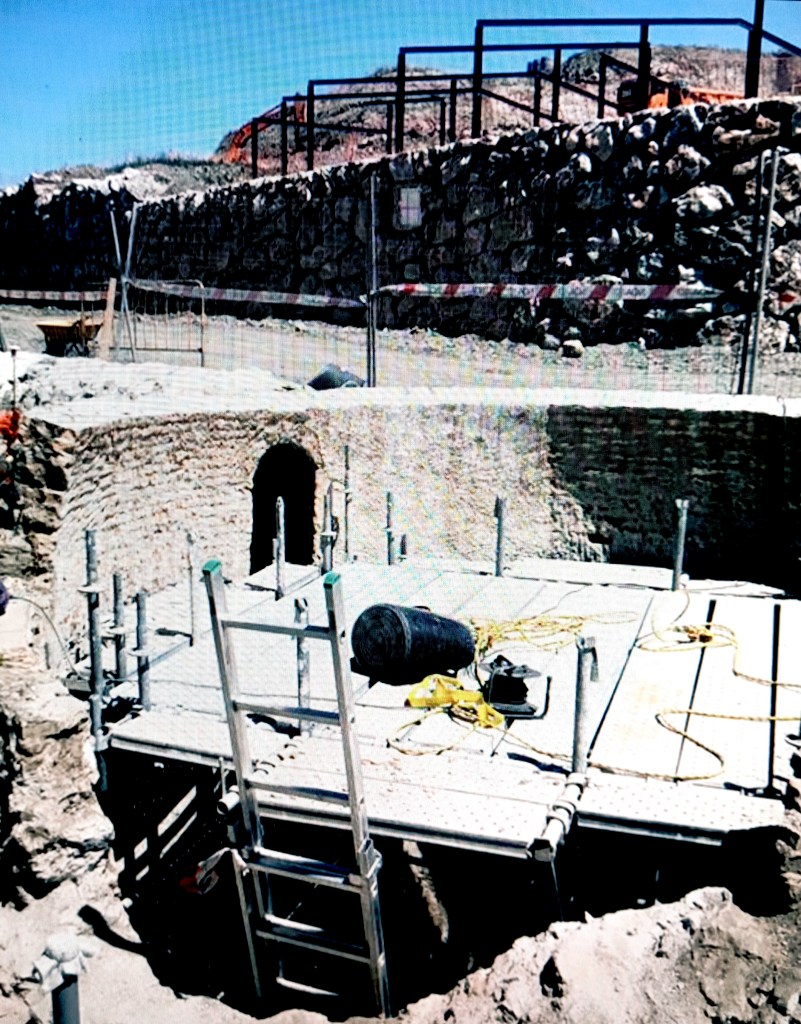 Foto 8. Segunda Arqueta de distribución. Detalles laterales donde se observa el uso de aparejo de tipo opus incertum. Aquí se muestra una imagen más amplia para que se vea algo más de su estructura, pero de lo que no cabe duda es de que esta arqueta está incompleta por destrucción de parte de ella durante el hallazgo.