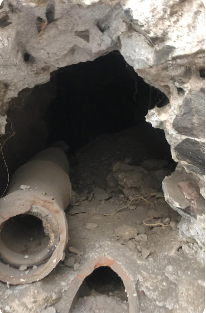 Foto 7. Segunda Arqueta de distribución localizada recientemente. Es de estructura circular como la anterior. En ella se aprecia la entrada del canal procedente la arqueta primera, porque el canal sin tuberías es que el procede del tramo de río Seco y vierte su agua en el depósito de decantación. La primera genera la segunda arqueta y canales de derivación que se dirigen a las villas rústicas cercanas, como la se San Sebastián y la finca Cercado de San Agustín, cercana a los colegios. Ha sido retocado y se espera que se respete su aparejo y revestimiento impermeabilizante. El agua que conducía no llegaba por canal, sino por un sistema de tuberías casi superpuestas tipo machihembradas, y esto desde la primera arqueta.