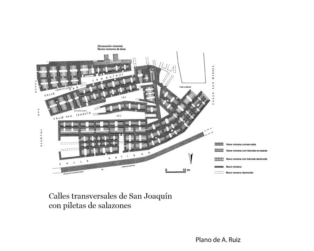 A propósito del derribo de un edificio antiguo en la ciudad, y apertura de nueva cimentación de vivienda en la calle Carmen Baja, situada en un nivel inferior a la calle San Joaquín, donde se encuentra el criptopórtico “Cueva de Siete Palacios”, en la parte central de la vivienda, se llevó a cabo un rebaje del terreno, apareciendo las estructuras de una serie de más de cinco piletas de salazones romanas. Pero se pudo comprobar que ese conjunto de piletas no terminaba en ese espacio, sino que se pudieron detectar otras que se encontraban en línea con las ya descubiertas, y en lo interiores de otras viviendas adyacentes que fueron remodeladas en sus estructuras algún tiempo después.[1]