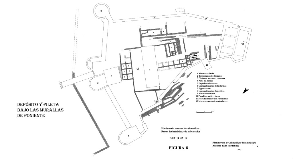 En esta zona, cota 40 aproximadamente, se localizó una pileta de salazones cuya parte superior salía por la base del muro de la propia vivienda, hacia la calle. Después se excavó y se apreció que se adentraba en la casa. Pero, como no se pudo, o no pudieron explorar más, la situación quedó como un hecho aislado; pero qué duda cabe de que una pileta no puede aparecer como una unidad aislada, sino que vienen apareciendo formando cadenas o grupos. Sin duda se trata de una serie como la de la calle Carmen Baja. Todos los hallazgos de este tipo son numerosos, como se ha visto en Morería alta. Y, como conclusión, se puede confirmar la opinión, sostenida desde un principio, de que Sexs era una factoría con todos sus elementos tanto de fabricación como de almacenamiento y exportación.