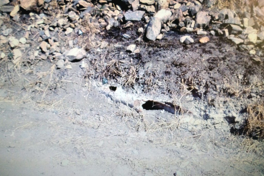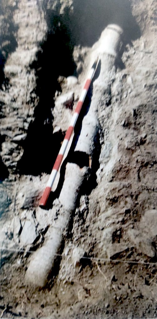 Foto 11. Detalle de una de las tuberías de cerámica que partían desde la arqueta de distribución primera. Partiendo de la arqueta, se dirigía hacia la parte baja de la Santa Cruz. Con las nuevas roturaciones del terreno, este resto ha desaparecido. El tipo de tubería es machihembrada y reforzada.