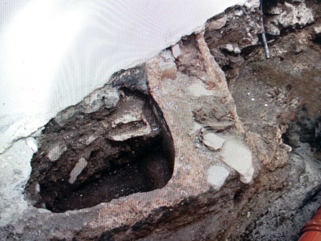 Foto 13. Aquí se nuestra la mayor prueba de que el agua del acueducto era transportada por tuberías de cerámica. En el punto donde apareció el primer arco del acueducto de la Carrera, se pudo ver la tubería, o parte de ella, por donde el agua era transportada. La tubería que se muestra, se encontraba empotrada sobre el canal que discurre por encima del acueducto. Y resulta un tanto extraño que fragmentos de estas tuberías no aparecieran en el la base cuando se excavó todo este tramo. Se supone que sí había estos de ella, y el hecho de la desastrosa excavación se realizara con retroexcavadoras da pie a creer que así ha ocurrido; perdida entre los desechos.