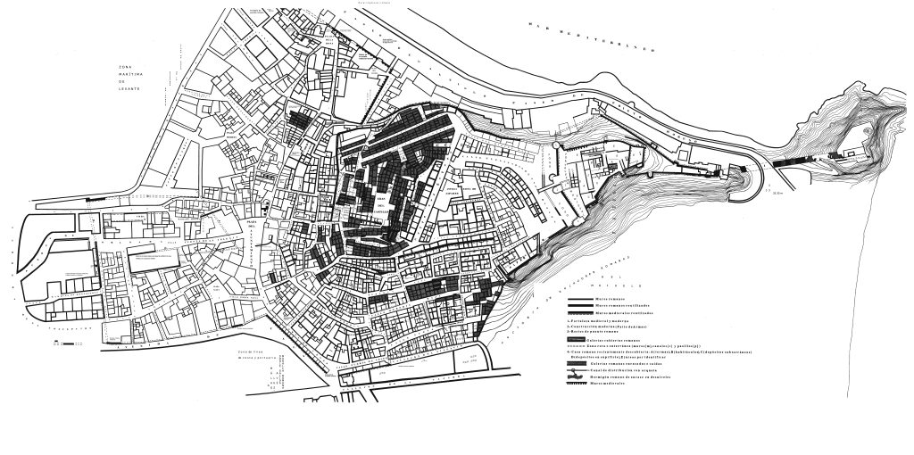 En este plano general del casco antiguo de Sexs se han marcado, con trazo en negrita, todos los elementos de lo que ha sido esta factoría para destacarlos sobre el resto que aún persiste oculto bajo las nuevas construcciones, o han sido destruidos en el proceso de «reurbanización» de todo esta gran industria romana heredada del pasado romano. Los elementos industriales se han localizado con mayor frecuencia en la zona de Poniente. Así, son más numerosas las piletas localizadas y excavadas a Poniente que en el centro o a Levante. Pero ello no significa que fueran menos frecuentes los hallazgos en el resto del conjunto. Lo que sí se ha llevado a cabo, en el período de fabricación, es situar el sistema de almacenaje cerca de los sectores que están próximos al mar, por economía en las distancias y por la situación de las condiciones de conservación de los producto guardados en los almacenes.