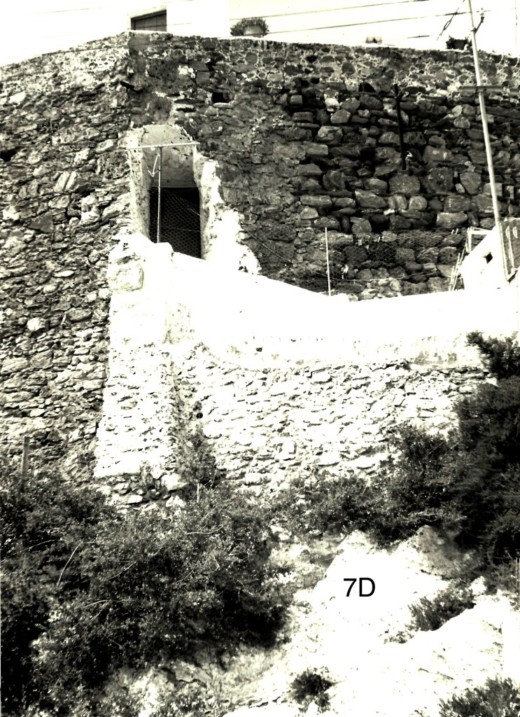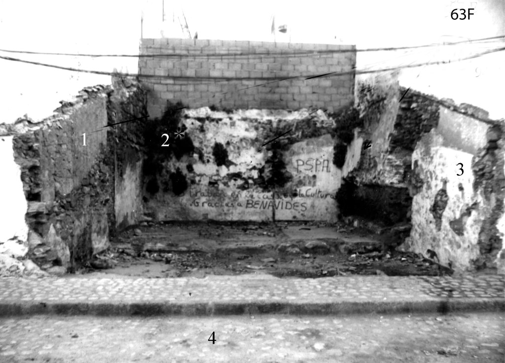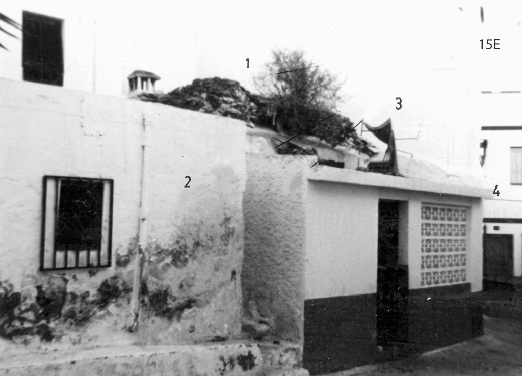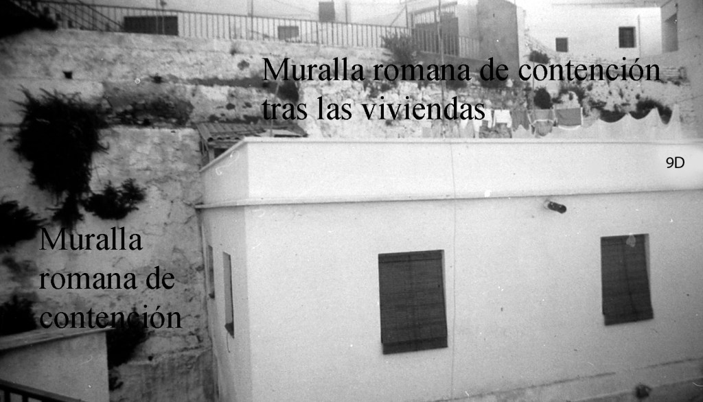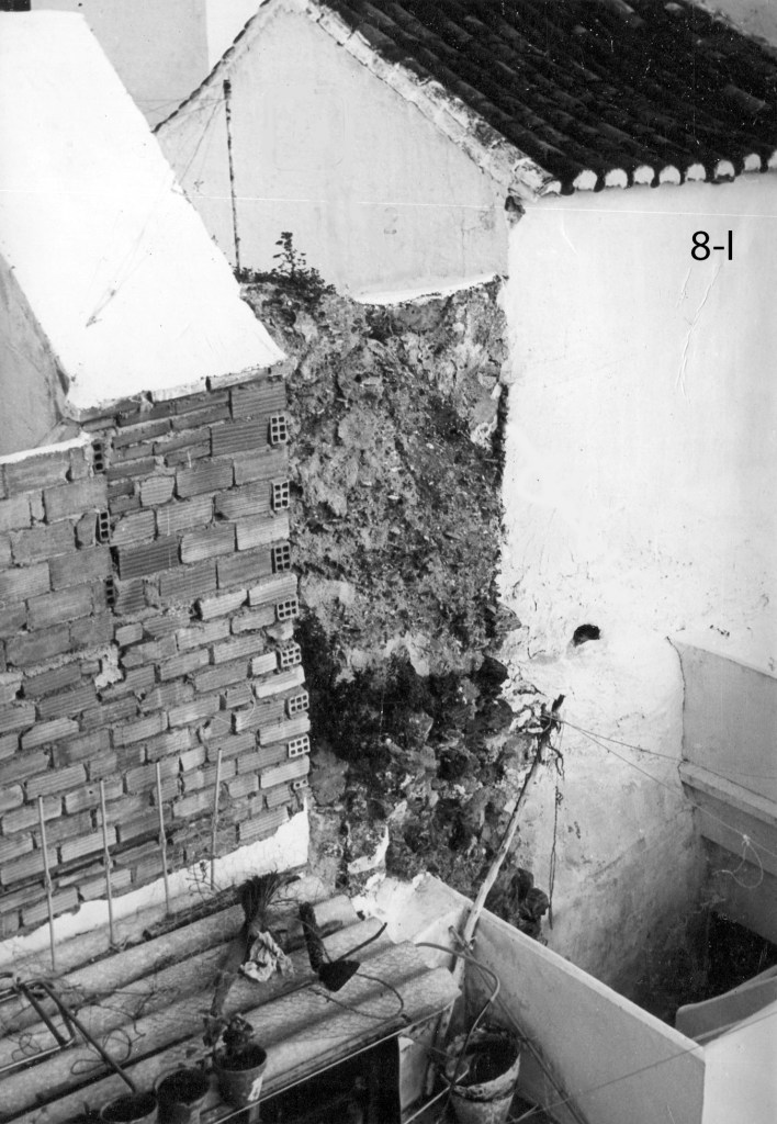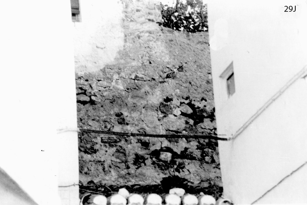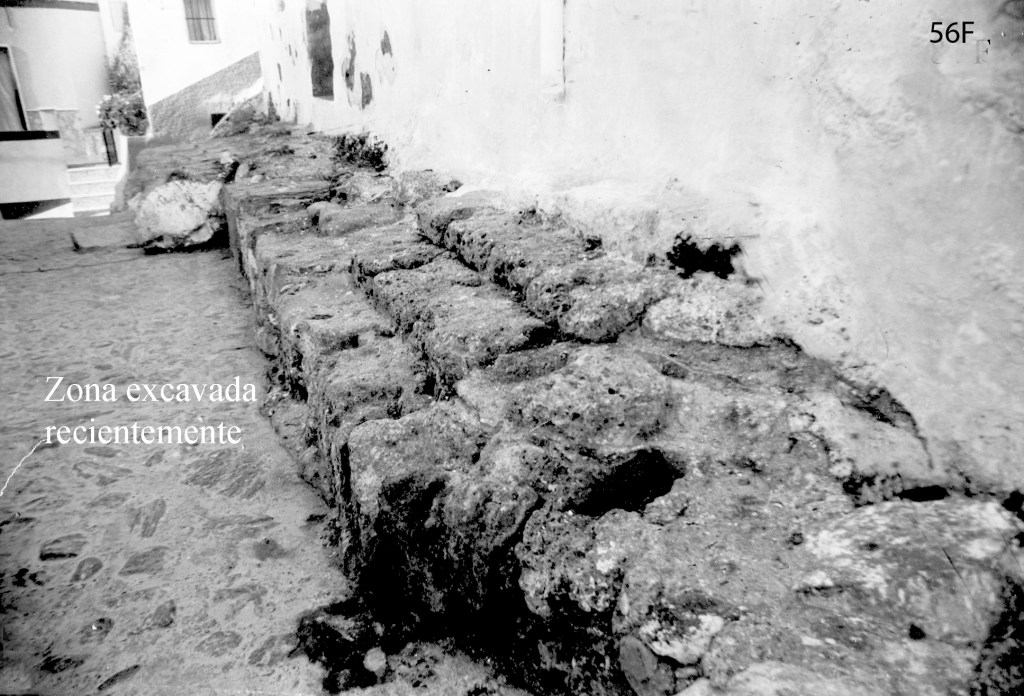 Así, desde la propia Avenida de Cala (fot. 27Y), pueden verse unos paramentos externos de casas, cuyos interiores muestran vestigios evidentes de su antigua función (fot. 28Y). El grosor es de 1,20 m.