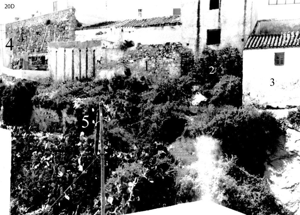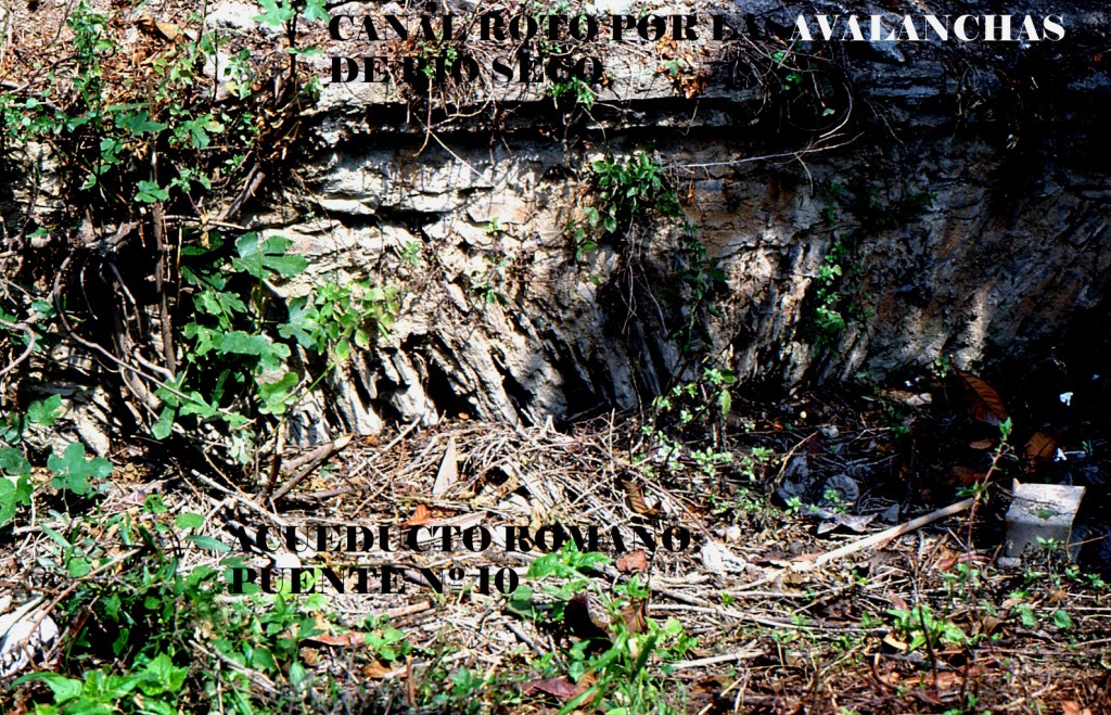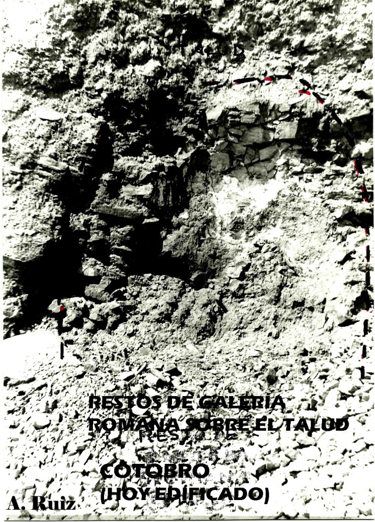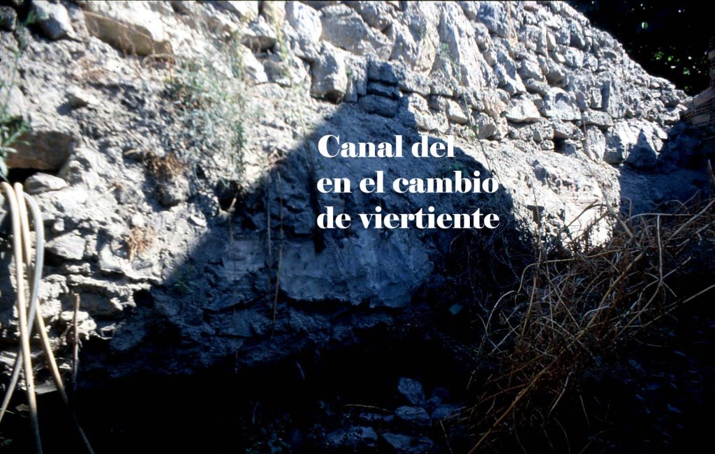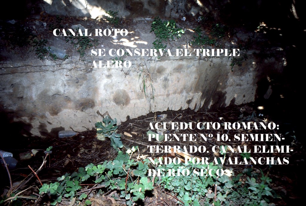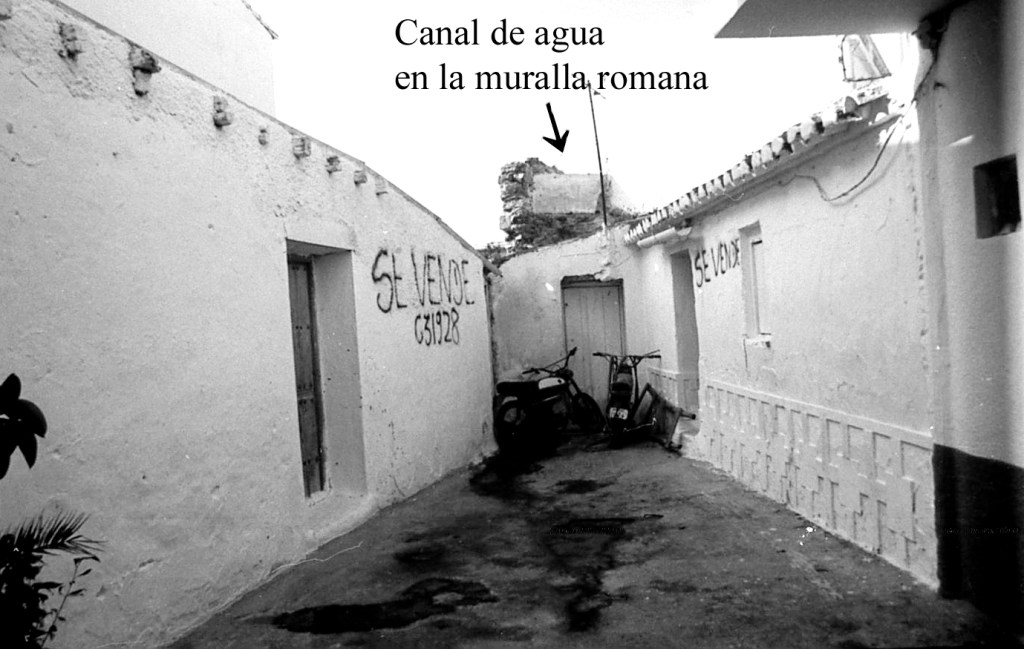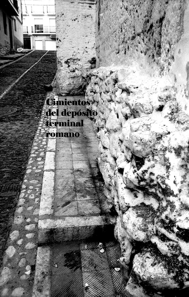 Ya en la fotografía 4Y, sobre un muro romano de contención que sujeta la calle Derrum-badero, puede observarse un agujero no artificial, sino antiguo y deformado, por donde se deja ver el canal de conducción de aguas que hasta la Huerta de los Müller llegaba.