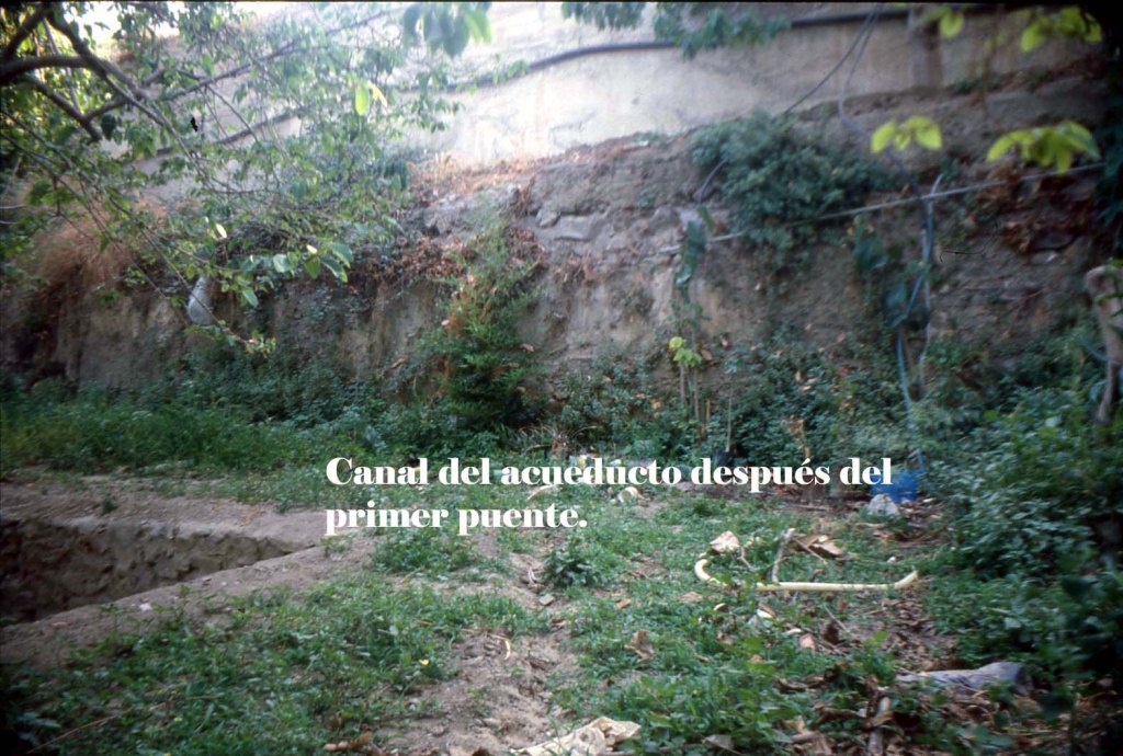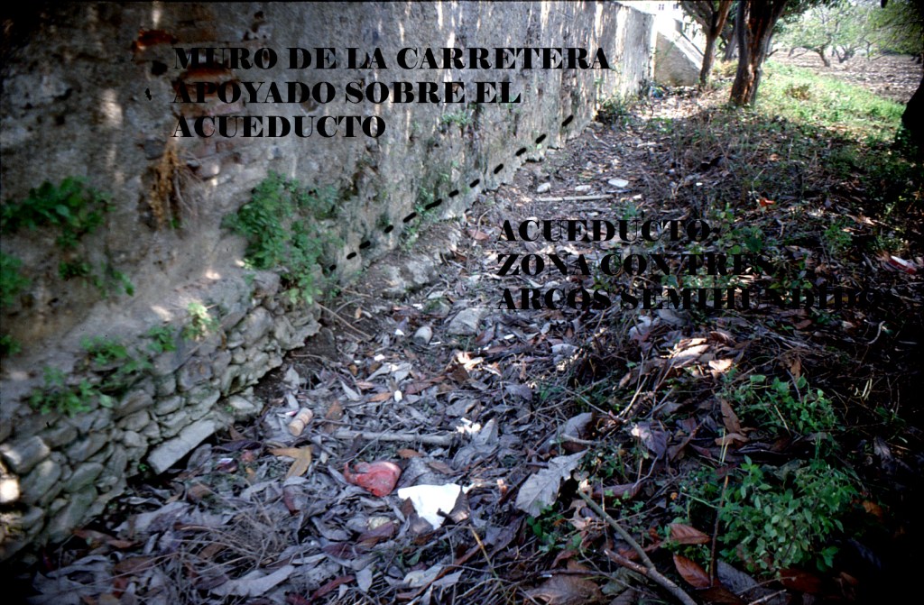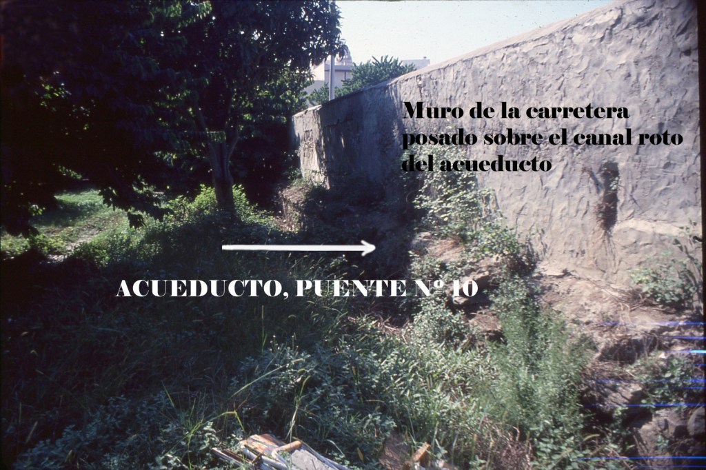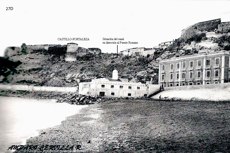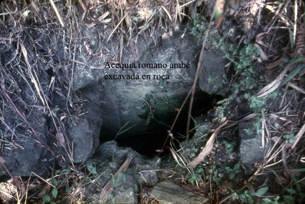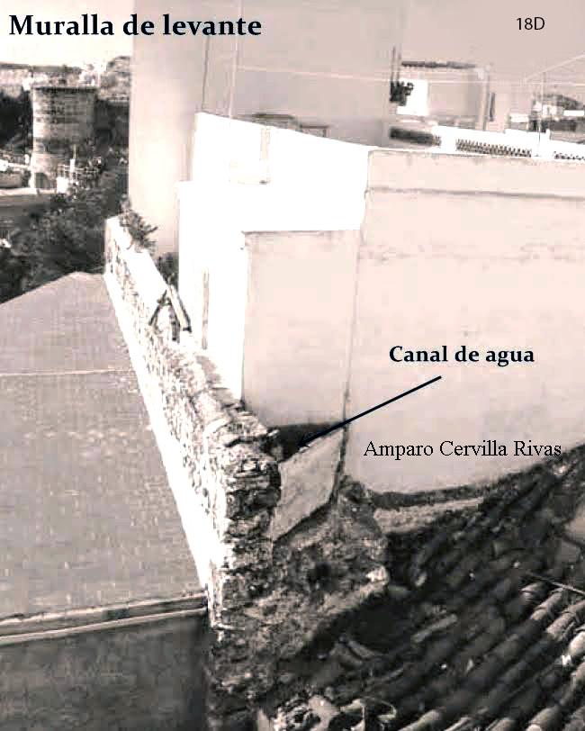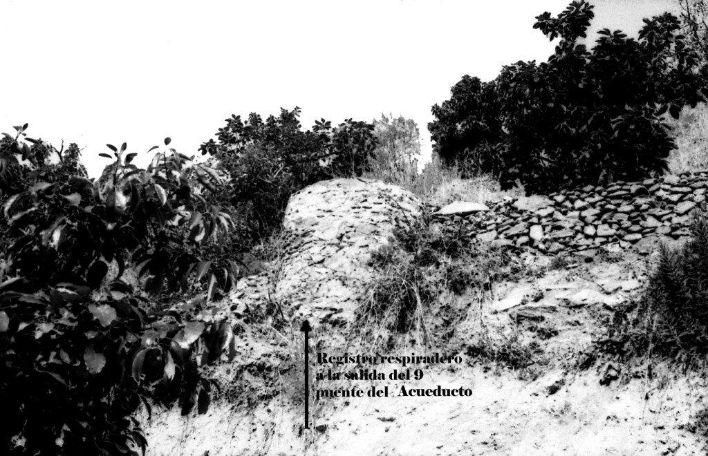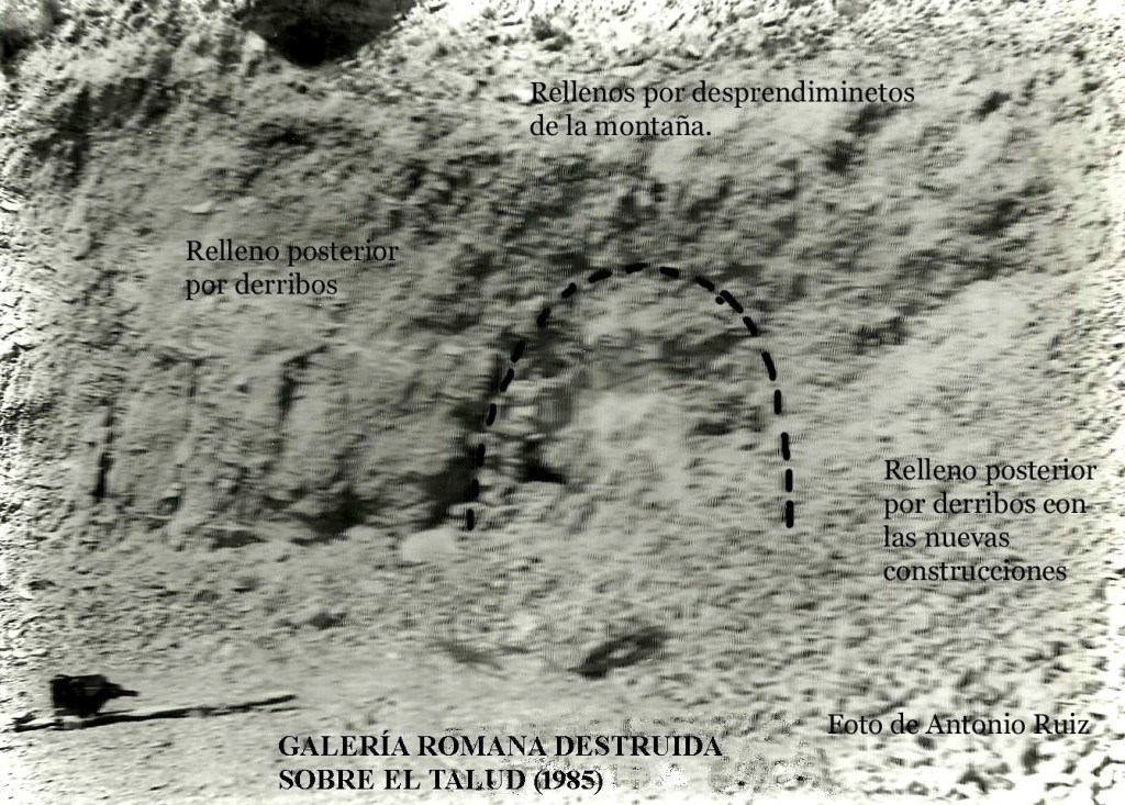 Ya en la fotografía 4Y, sobre un muro romano de contención que sujeta la calle Derrum-badero, puede observarse un agujero no artificial, sino antiguo y deformado, por donde se deja ver el canal de conducción de aguas que hasta la Huerta de los Müller llegaba.