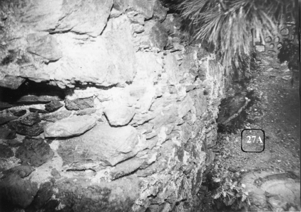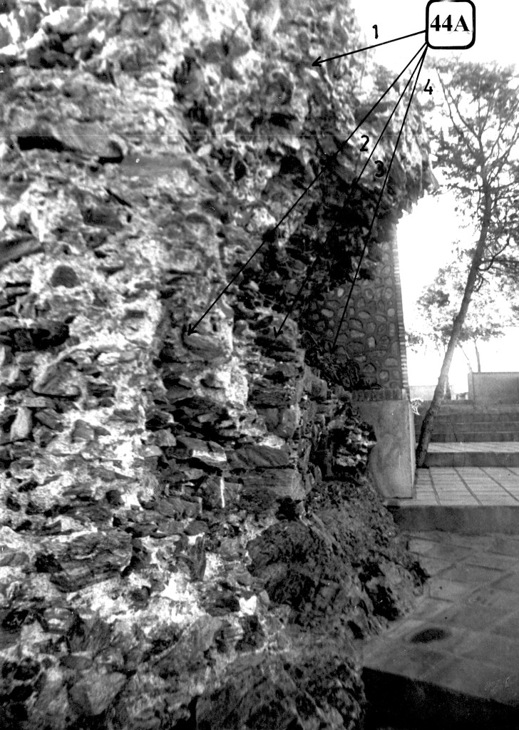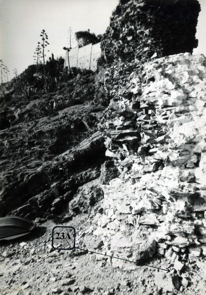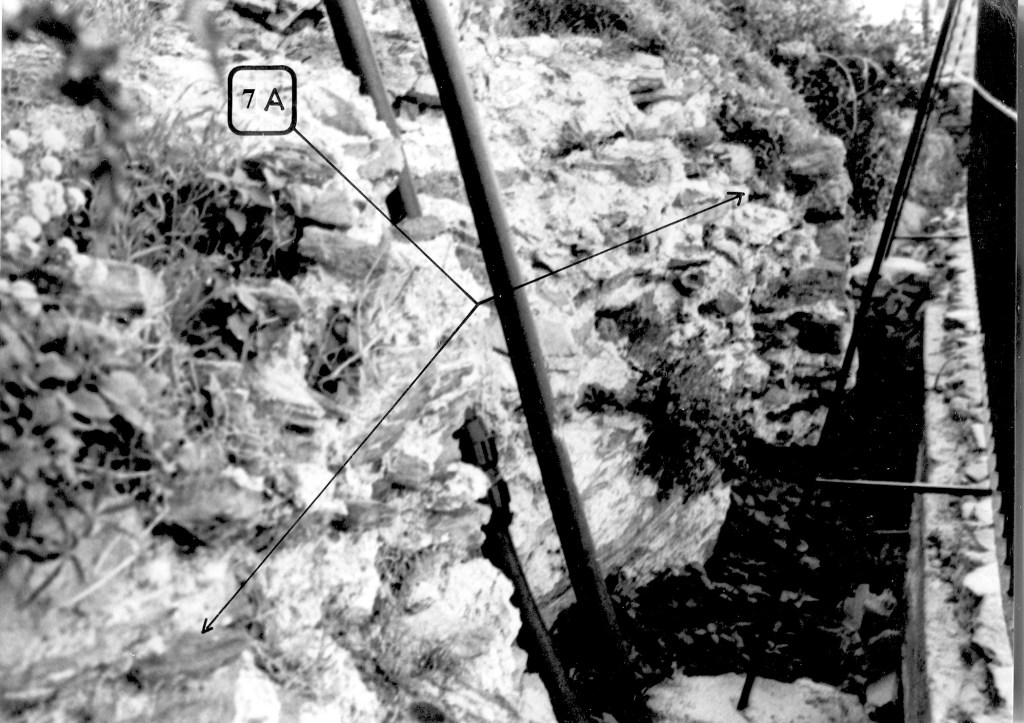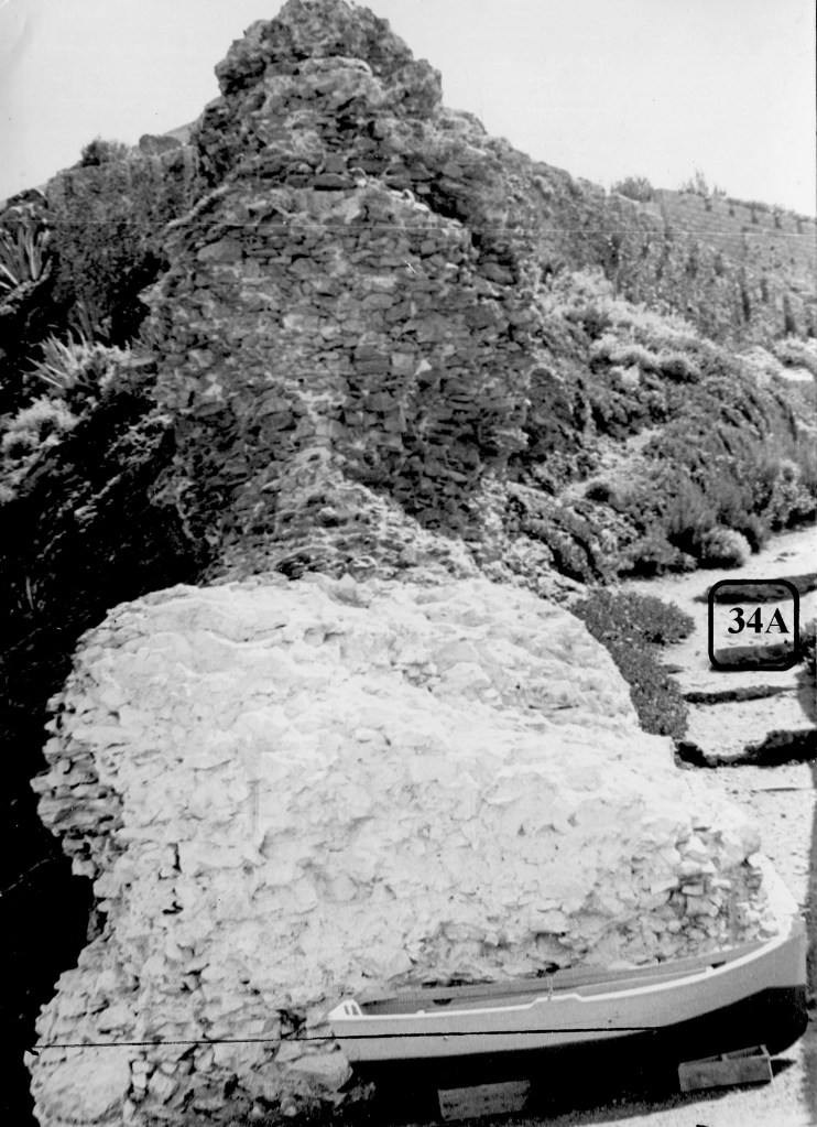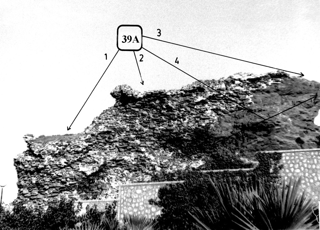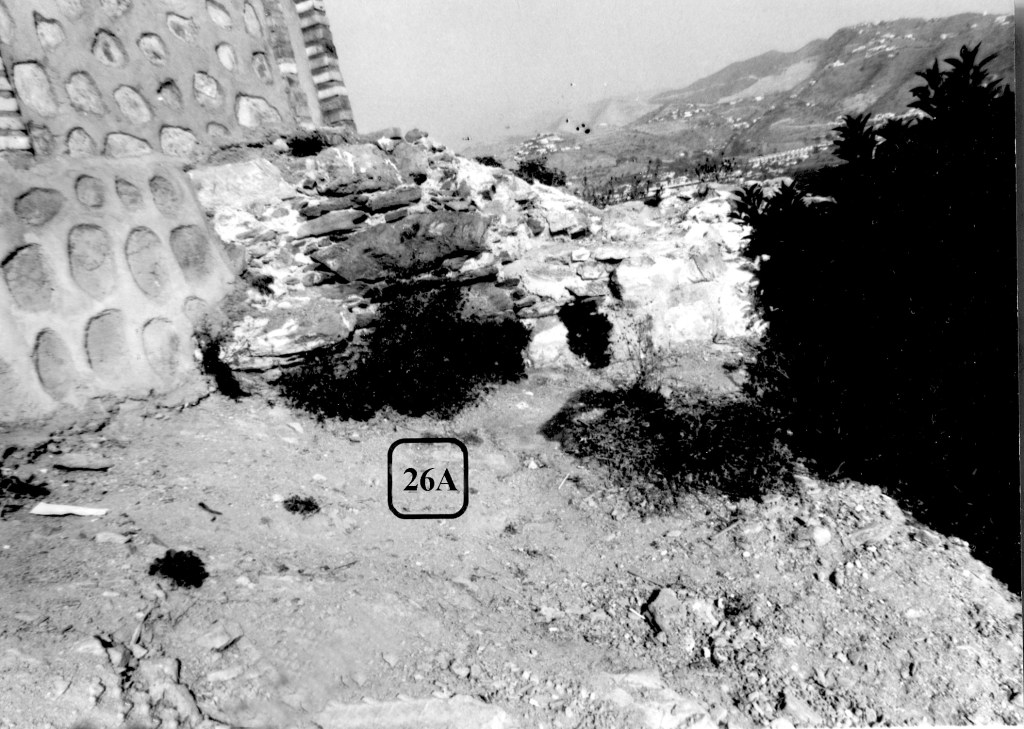 Los detalles de mayor envergadura de los cimientos que se suponen aquí, se tienen bien patentes en las fotos 39Y y 40Y, donde se observa la rotura de las estructuras murales o base de las edificaciones hídricas que aquí han existido. De forma más detallada aún, se pueden ver fotos de precisión, en que se observa la rotura, comprobada por la irregularidad del aparejo, analizable a simple vista (fots. 40Y; 42Y).