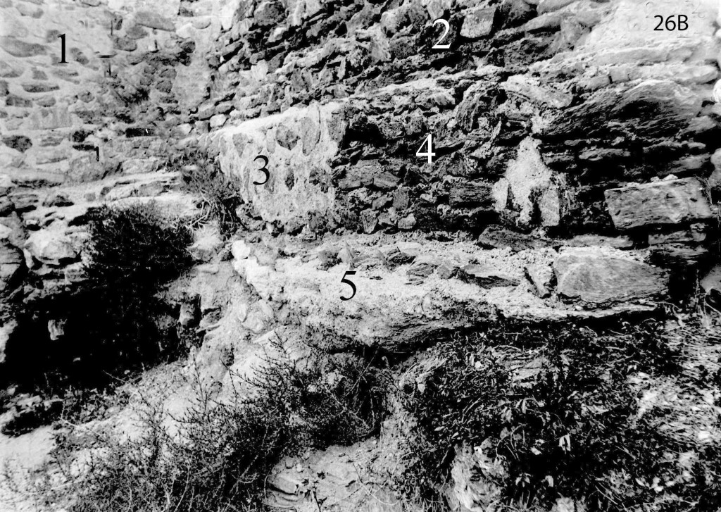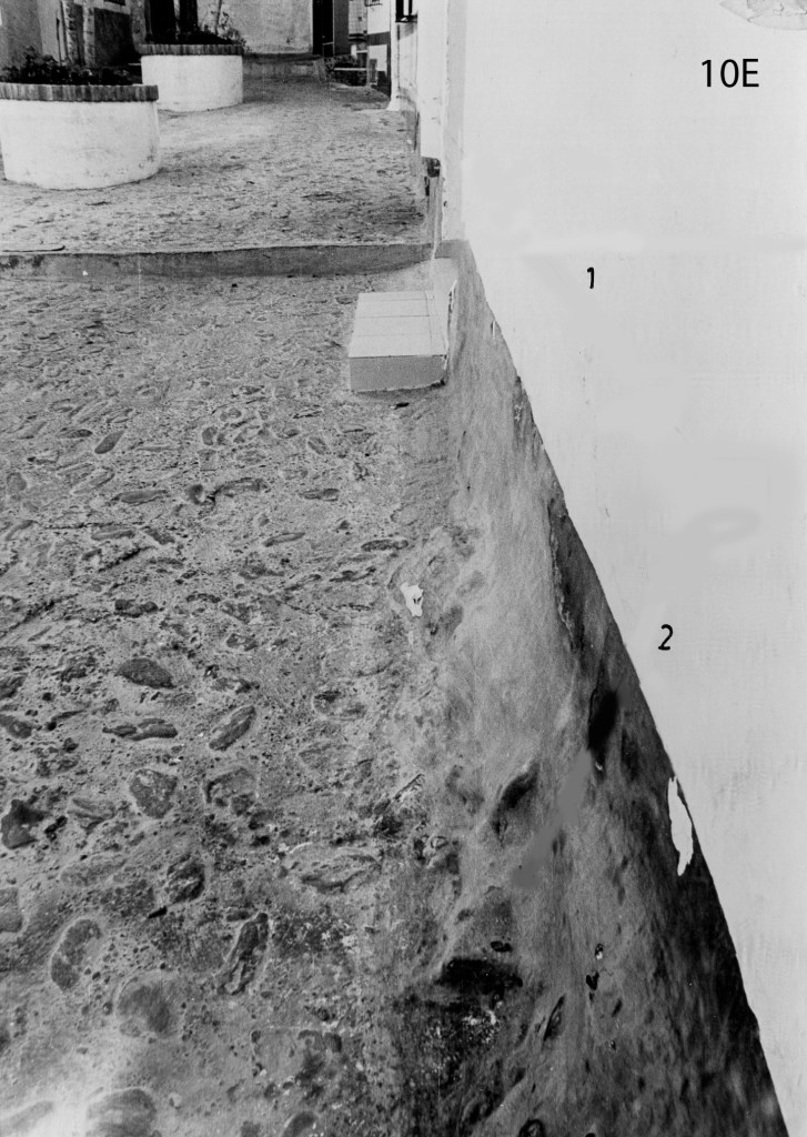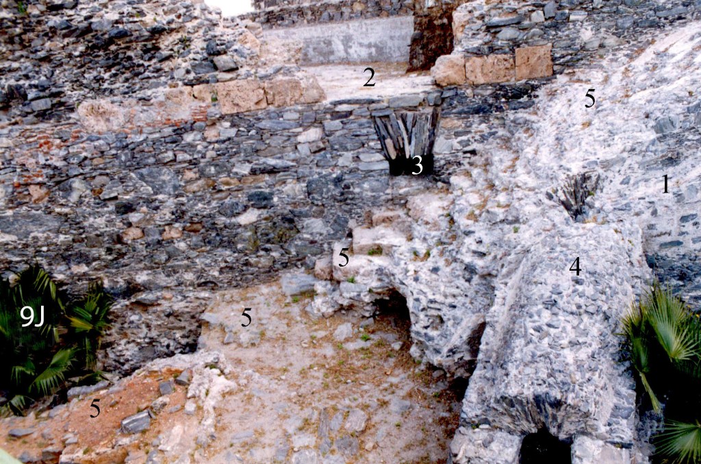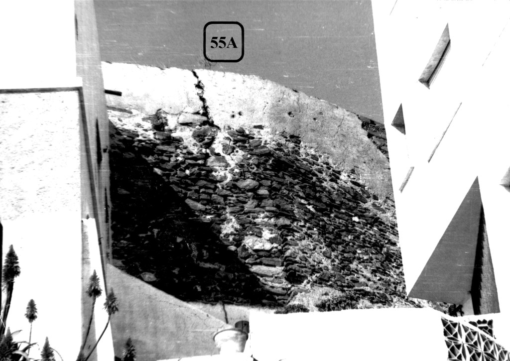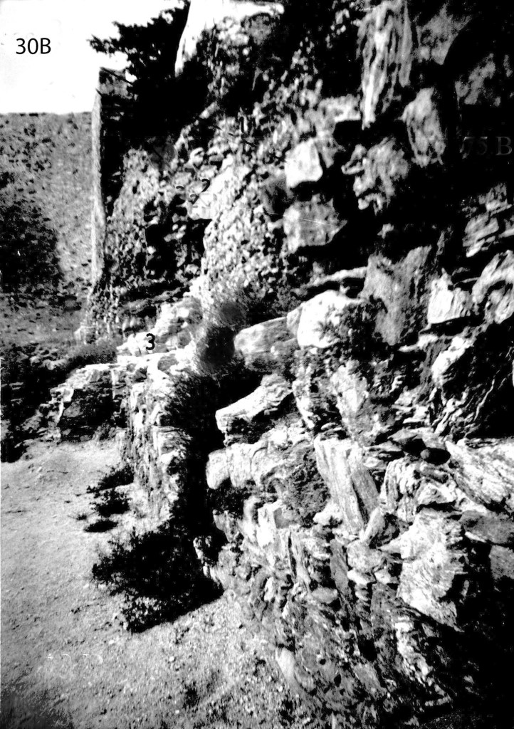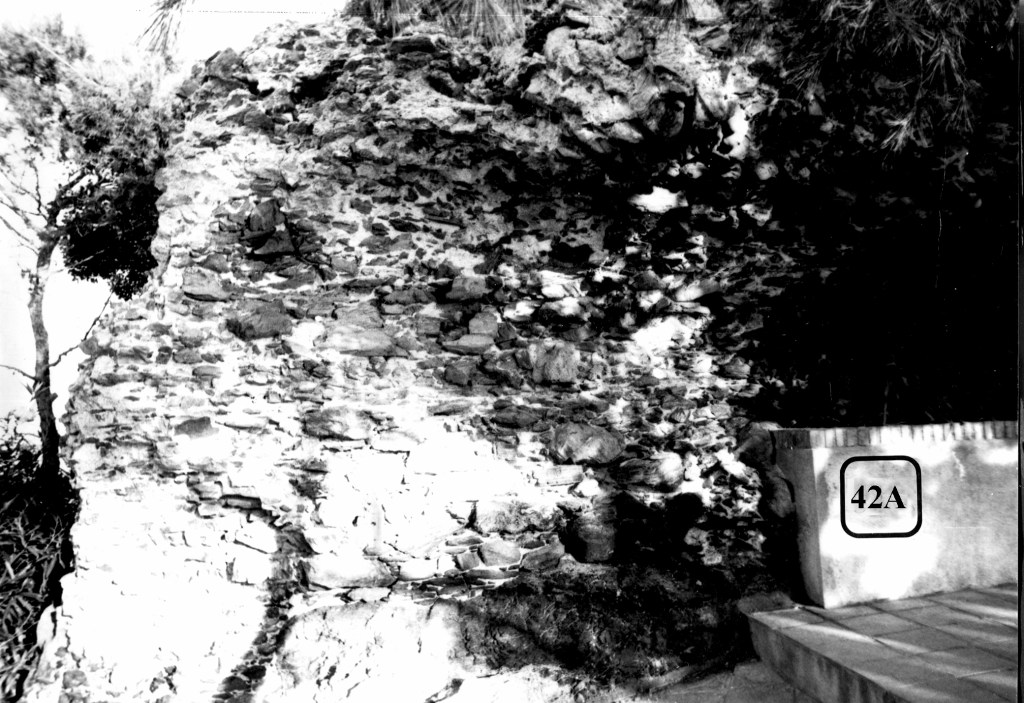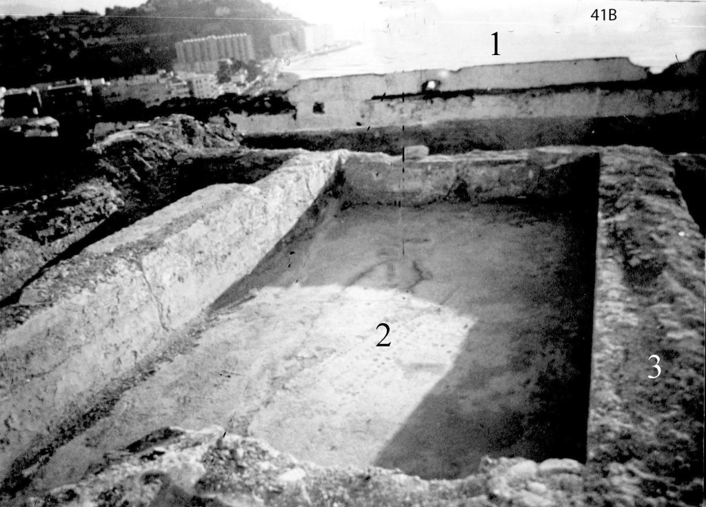 Los detalles de mayor envergadura de los cimientos que se suponen aquí, se tienen bien patentes en las fotos 39Y y 40Y, donde se observa la rotura de las estructuras murales o base de las edificaciones hídricas que aquí han existido. De forma más detallada aún, se pueden ver fotos de precisión, en que se observa la rotura, comprobada por la irregularidad del aparejo, analizable a simple vista (fots. 40Y; 42Y).
