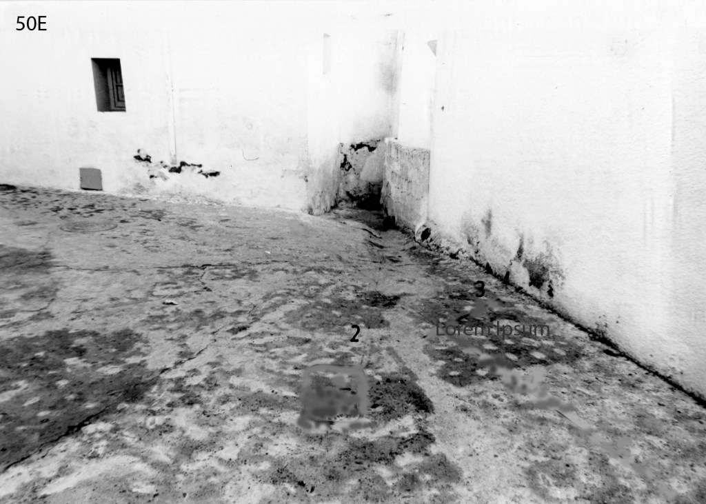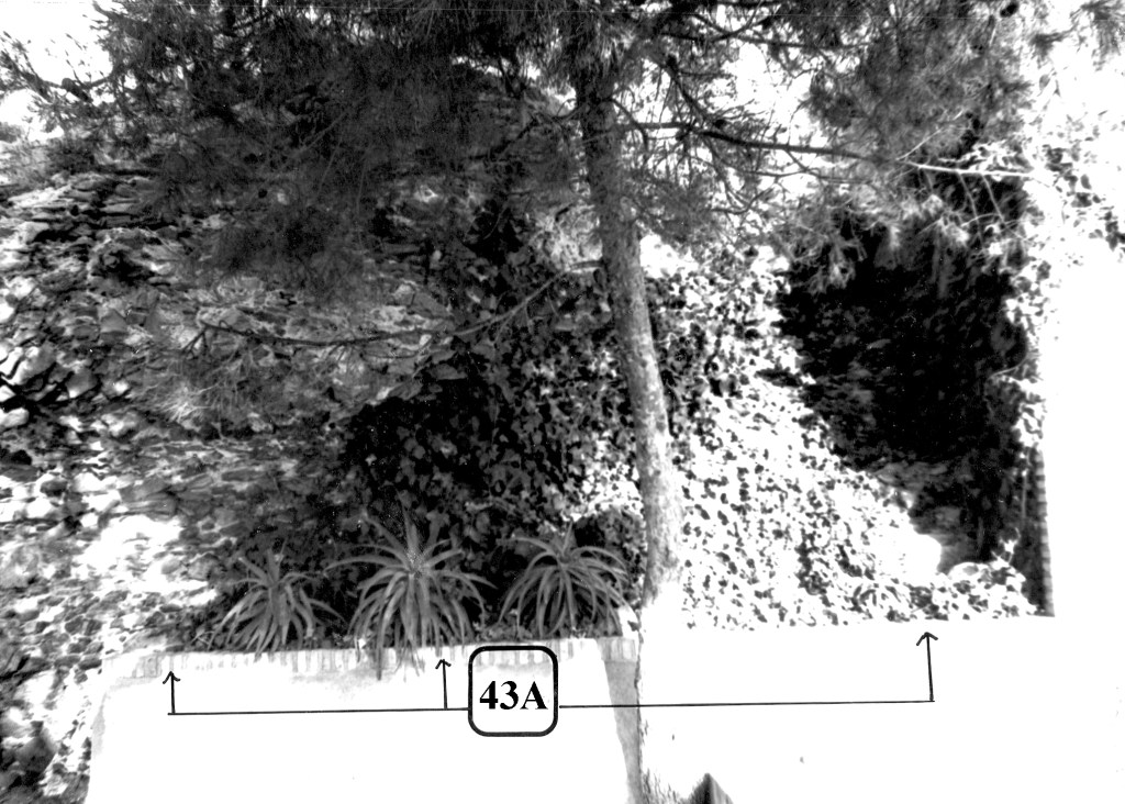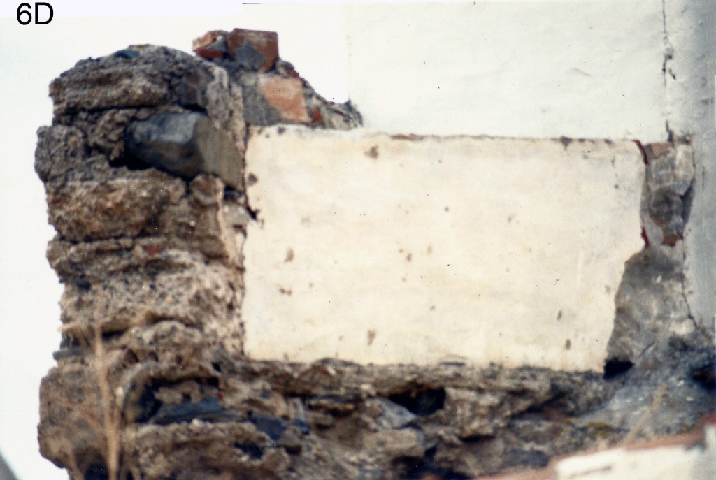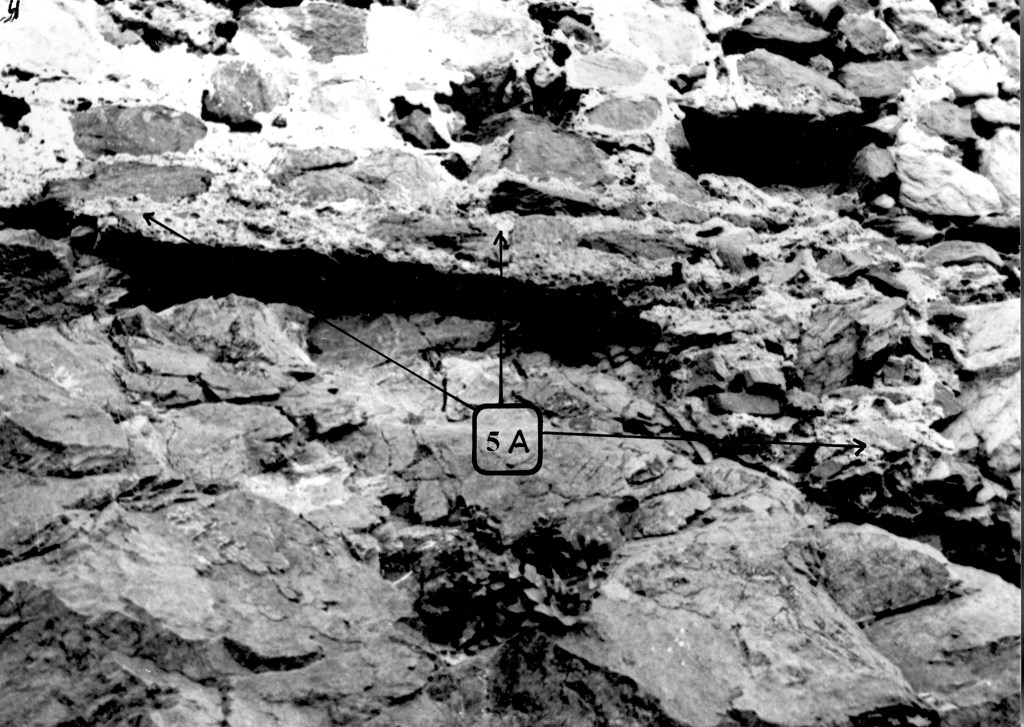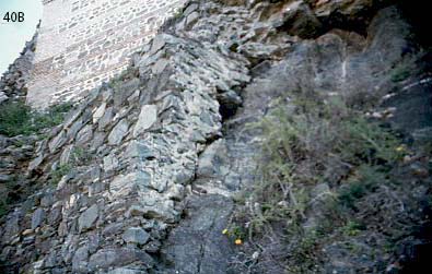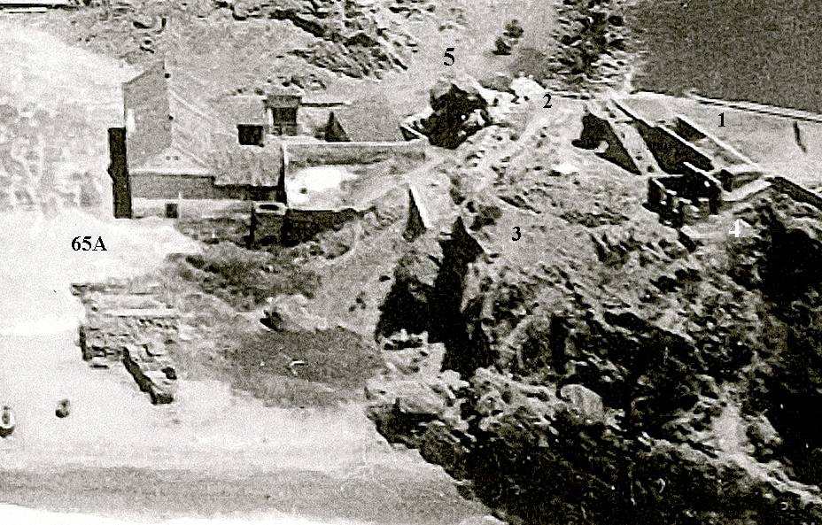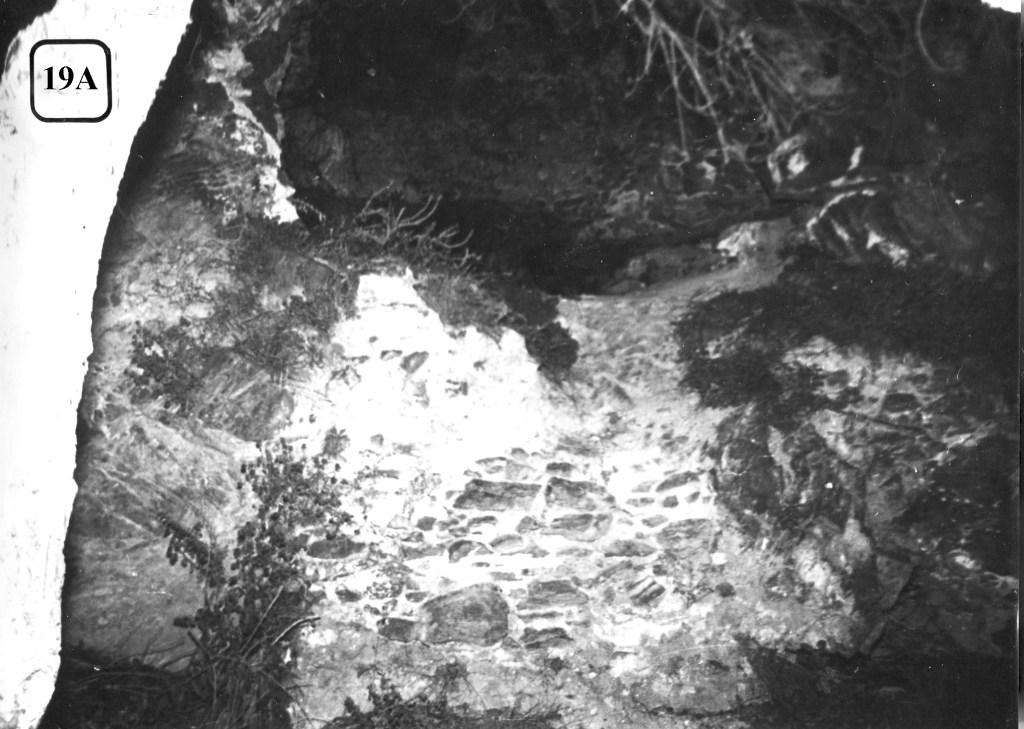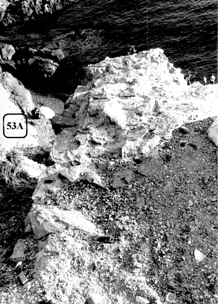Los detalles de mayor envergadura de los cimientos que se suponen aquí, se tienen bien patentes en las fotos 39Y y 40Y, donde se observa la rotura de las estructuras murales o base de las edificaciones hídricas que aquí han existido. De forma más detallada aún, se pueden ver fotos de precisión, en que se observa la rotura, comprobada por la irregularidad del aparejo, analizable a simple vista (fots. 40Y; 42Y).