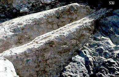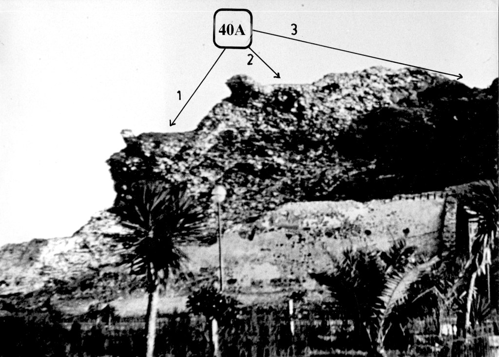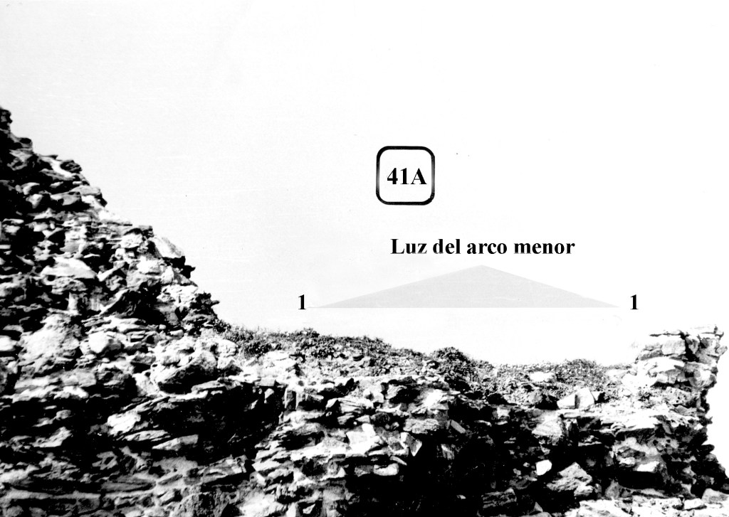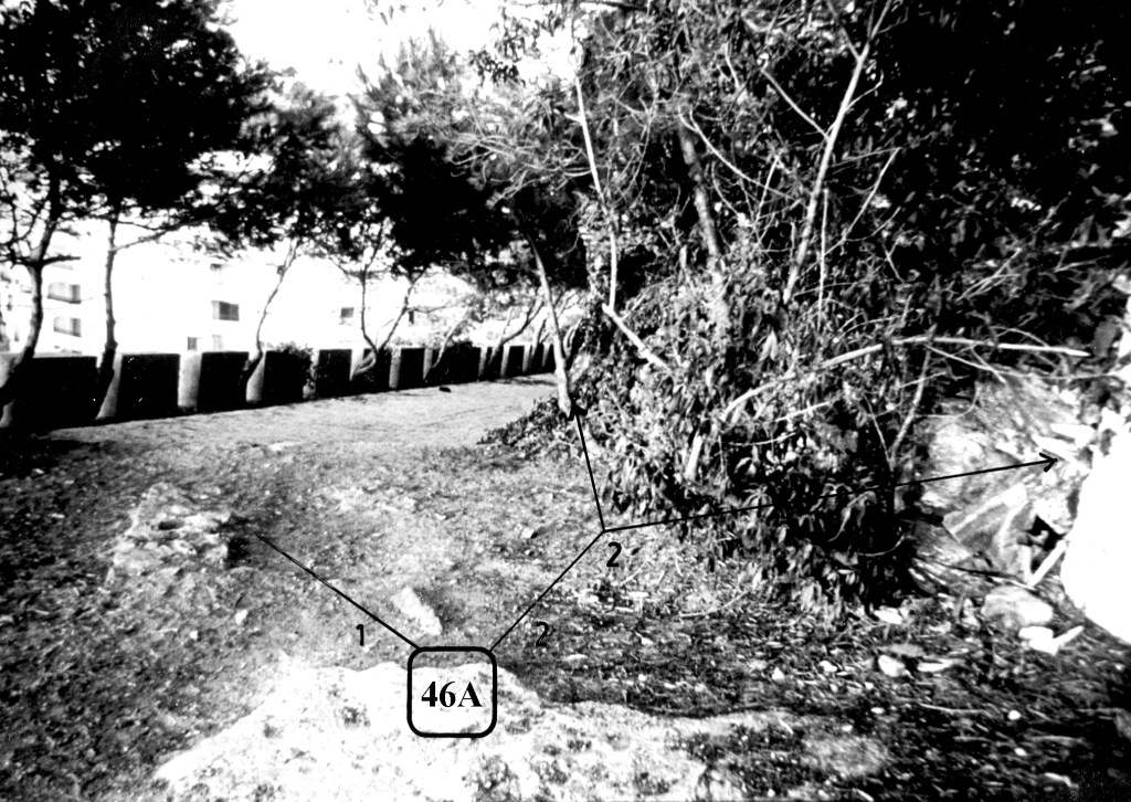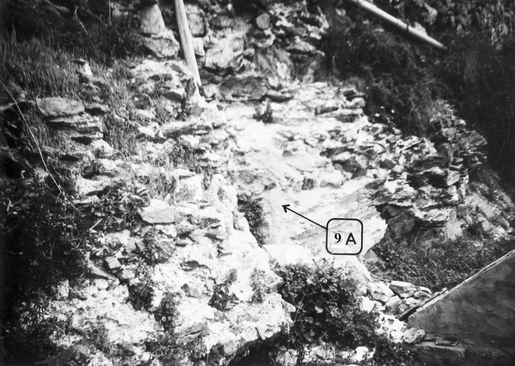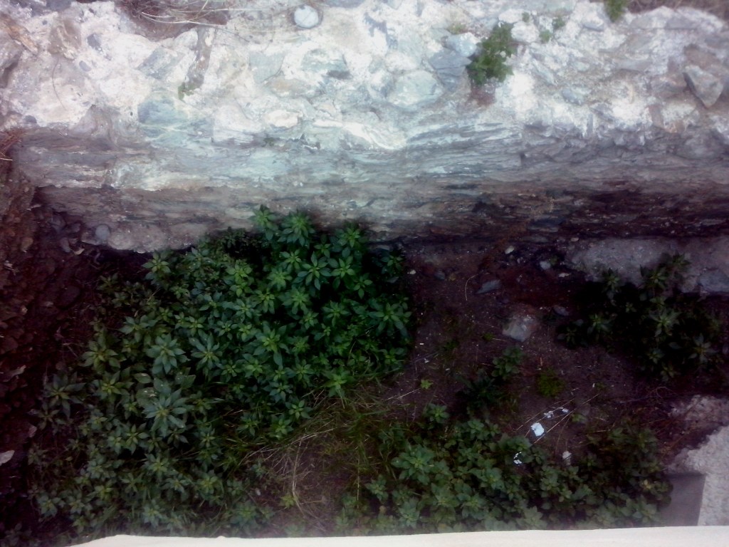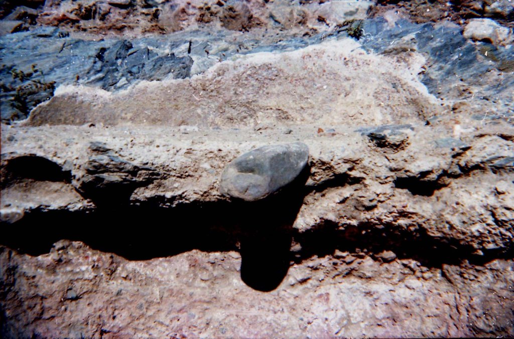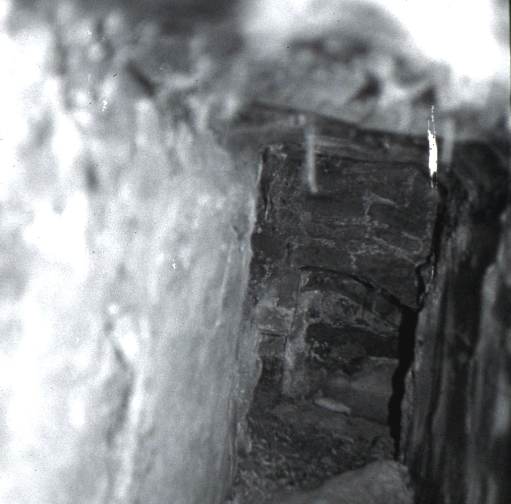 Los detalles de mayor envergadura de los cimientos que se suponen aquí, se tienen bien patentes en las fotos 39Y y 40Y, donde se observa la rotura de las estructuras murales o base de las edificaciones hídricas que aquí han existido. De forma más detallada aún, se pueden ver fotos de precisión, en que se observa la rotura, comprobada por la irregularidad del aparejo, analizable a simple vista (fots. 40Y; 42Y).