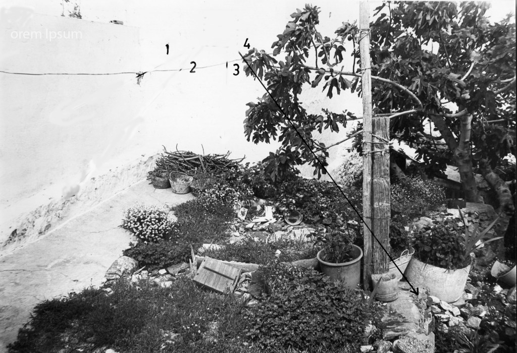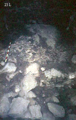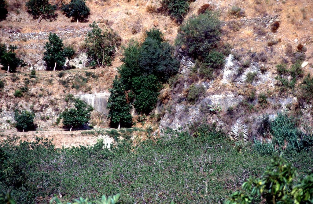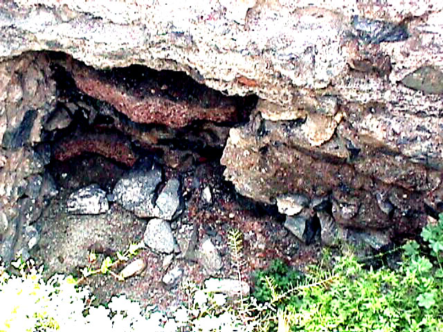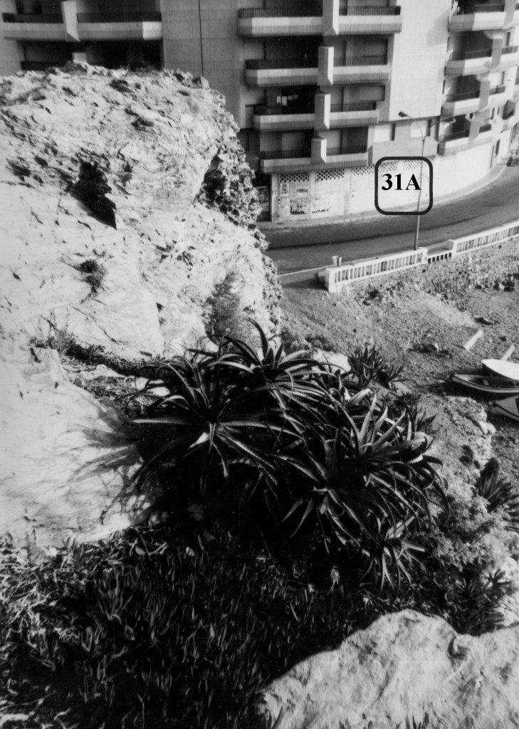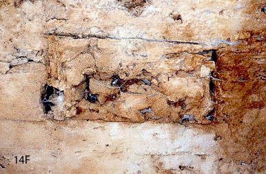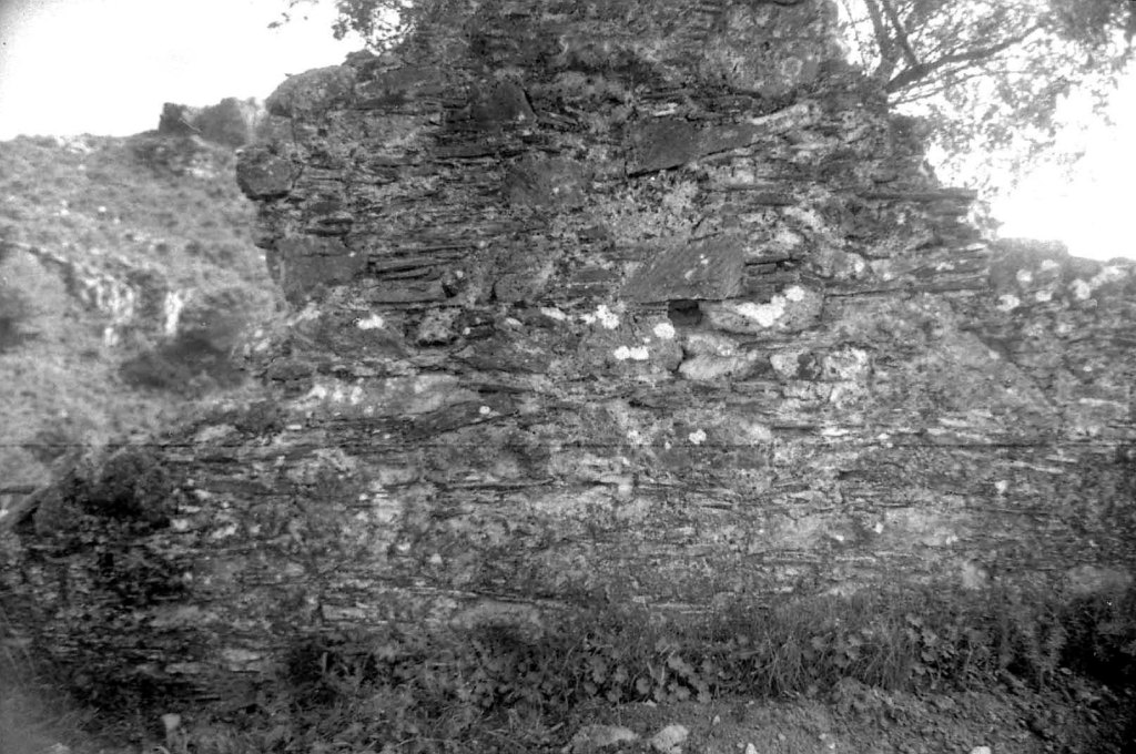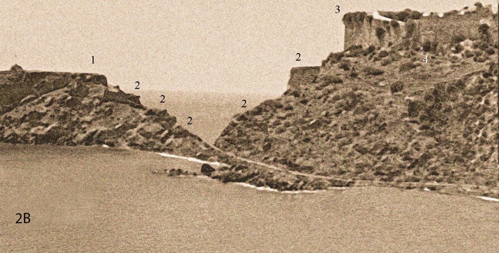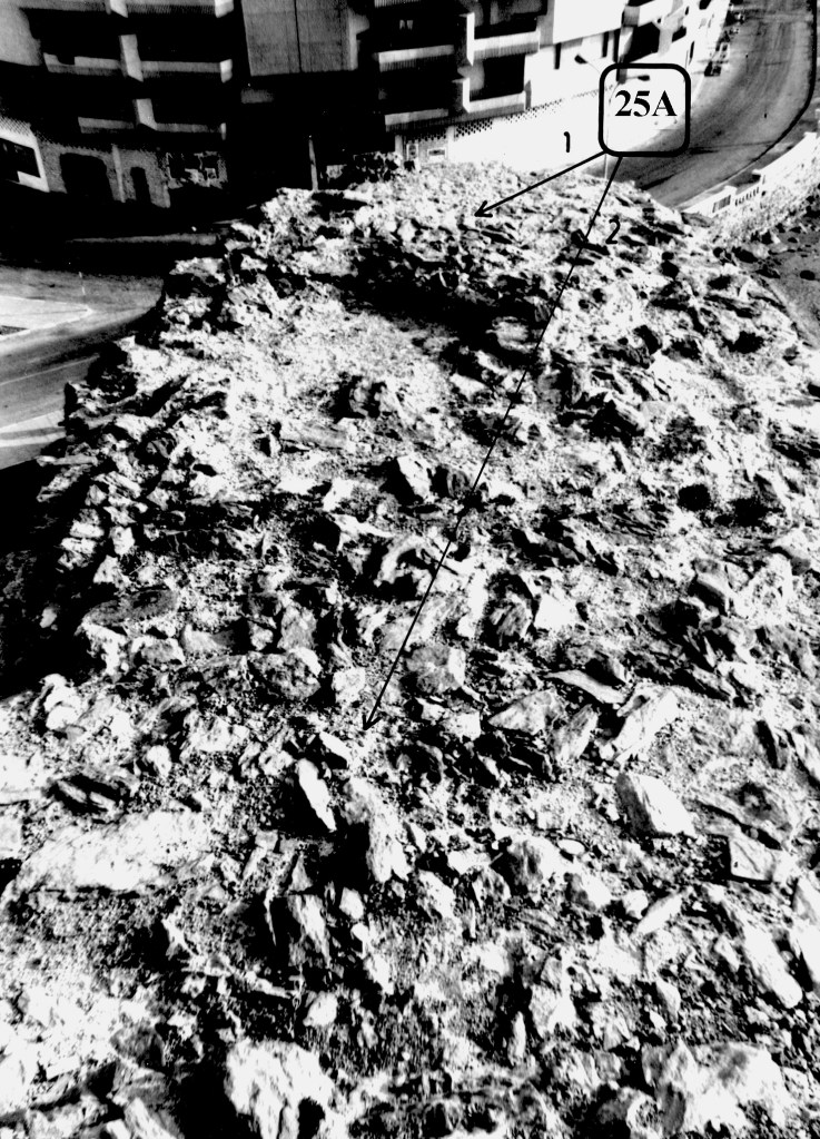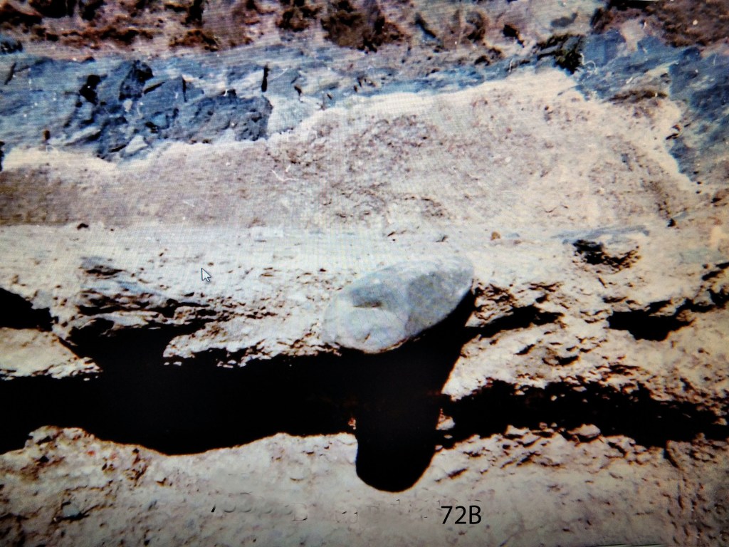 Los detalles de mayor envergadura de los cimientos que se suponen aquí, se tienen bien patentes en las fotos 39Y y 40Y, donde se observa la rotura de las estructuras murales o base de las edificaciones hídricas que aquí han existido. De forma más detallada aún, se pueden ver fotos de precisión, en que se observa la rotura, comprobada por la irregularidad del aparejo, analizable a simple vista (fots. 40Y; 42Y).