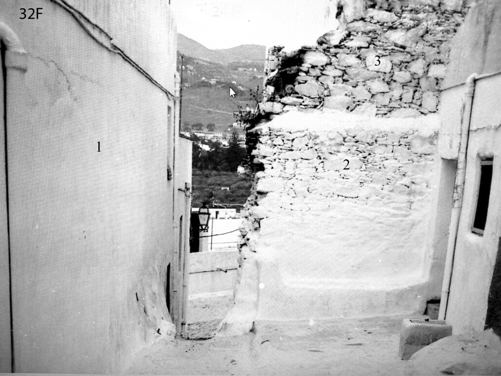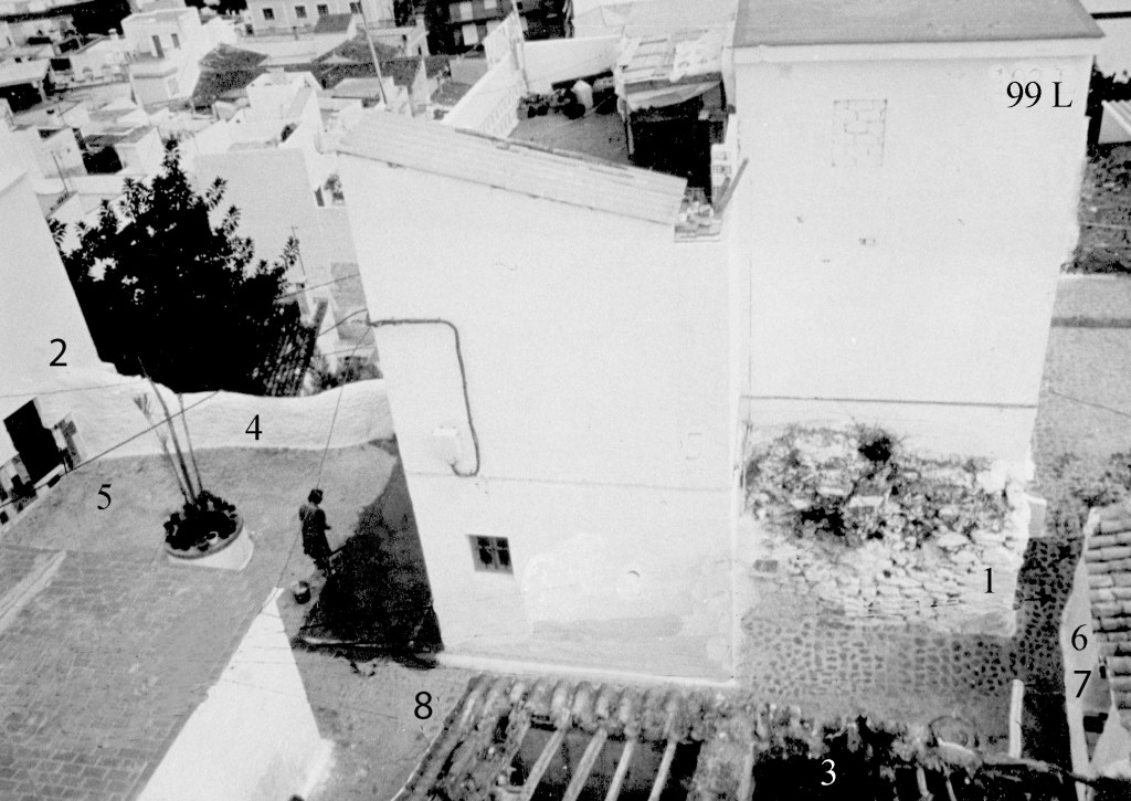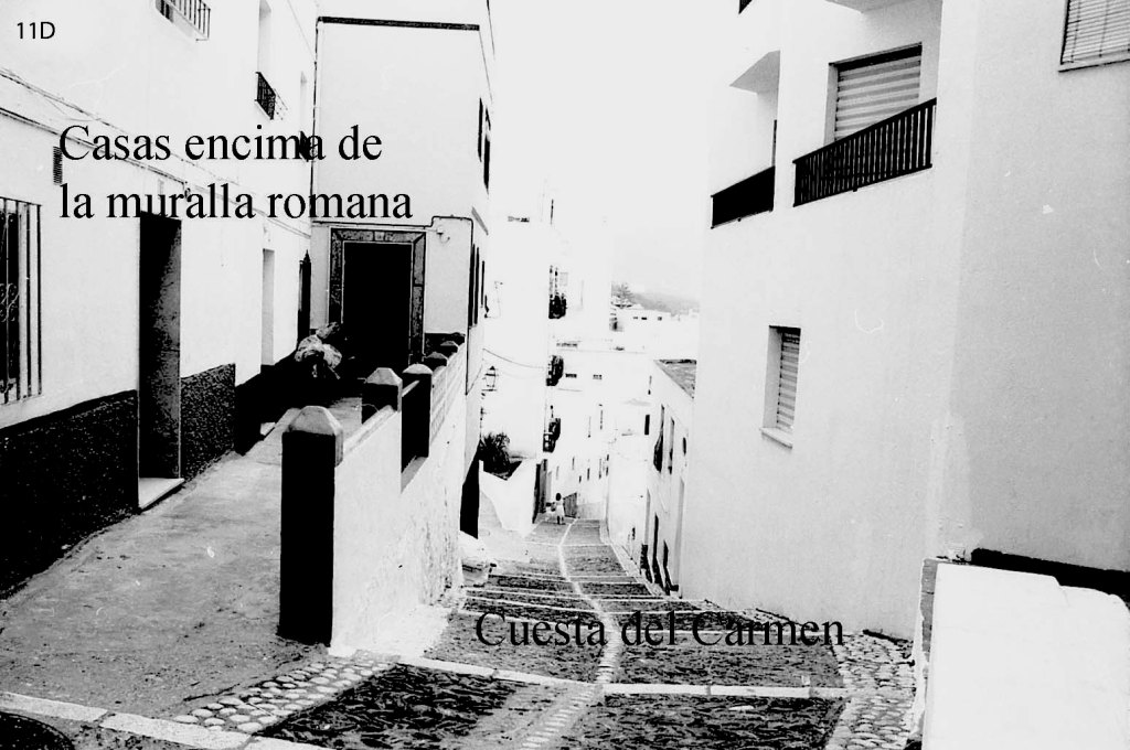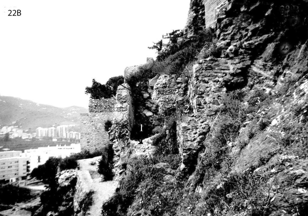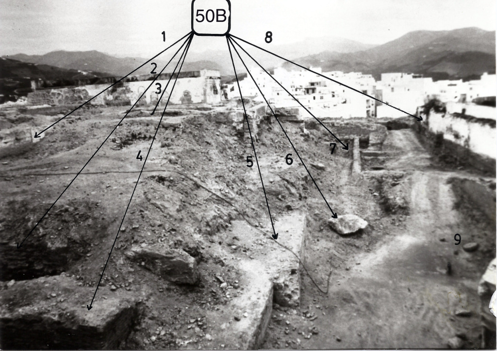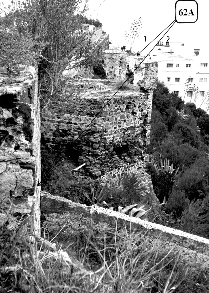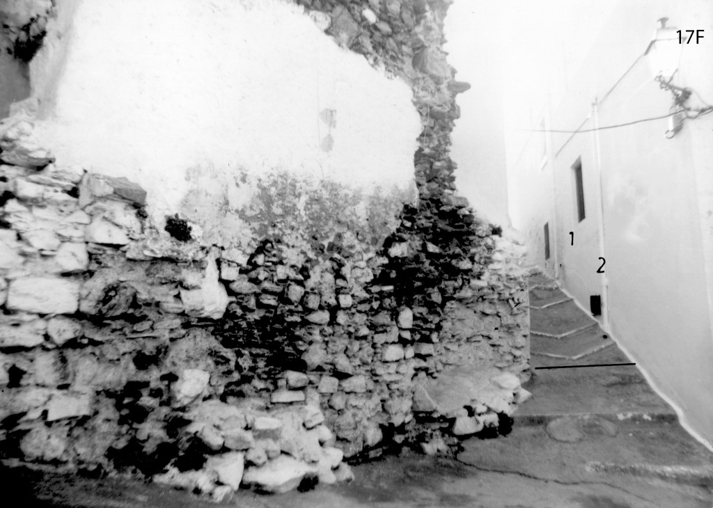 Se produce al final del último tramo, que acabamos de describir, un fuerte giro a dere-cha, según se avanza en ese sentido, y se ve toda una secuencia de casas, cuyas bases y cimientos están montados sobre la muralla previamente arrasada hasta casi el suelo (fot. 34Y). El uso de los podia se justifica precisamente por encontrarse, a causa de la muralla, por debajo del nivel de la calle Vélez, situada justo detrás. Toda esta secuencia de muralla termina en la denominada Puerta de Vélez, que se encontraba al final del último tramo que acabamos de analizar.