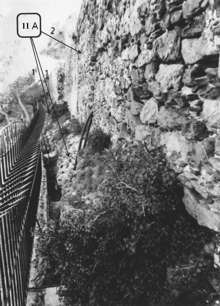 Dentro de la línea de defensa que se viene describiendo, se puede indicar una marca de continuidad del sistema en la foto 8Y, donde se aprecia la existencia de fuerte muro a media escalera, que conecta con el anteriormente descrito.