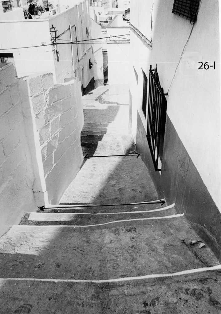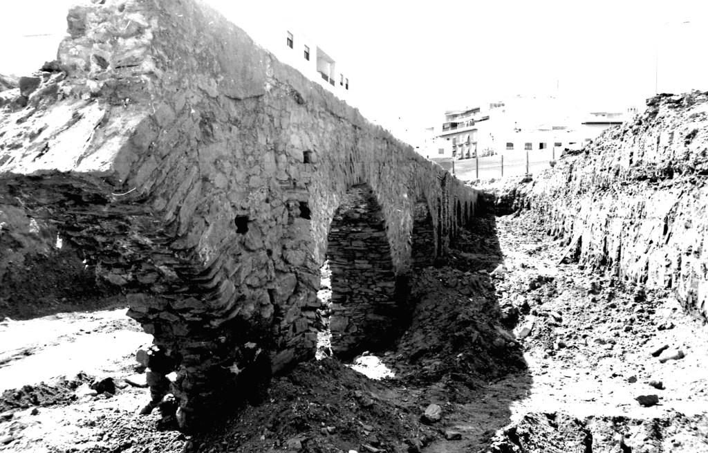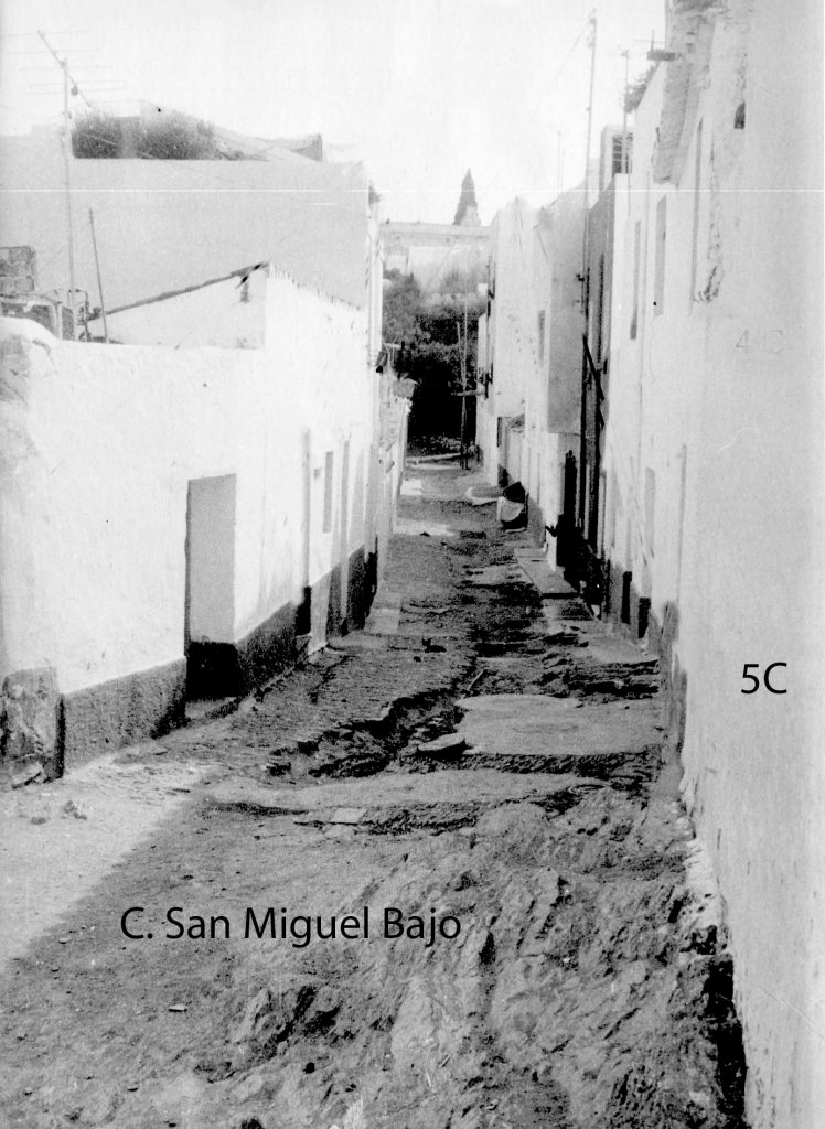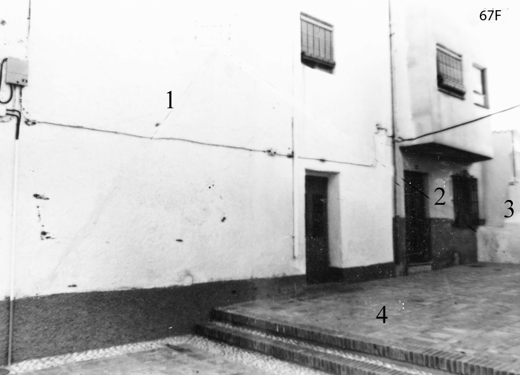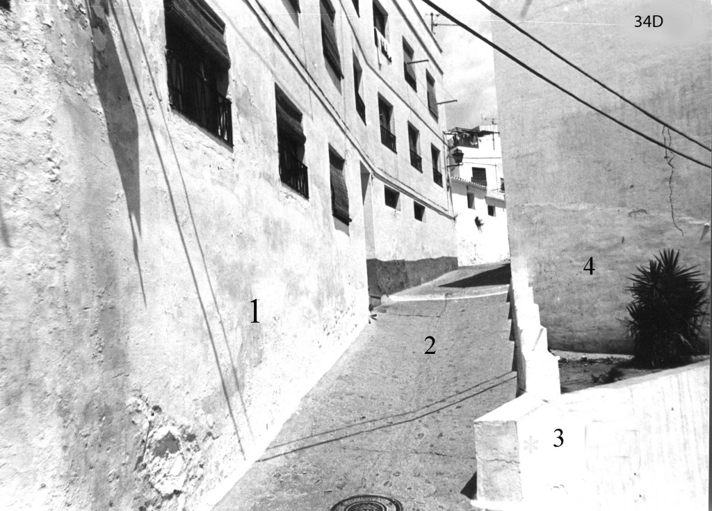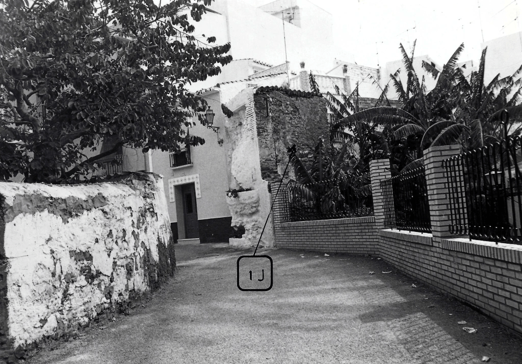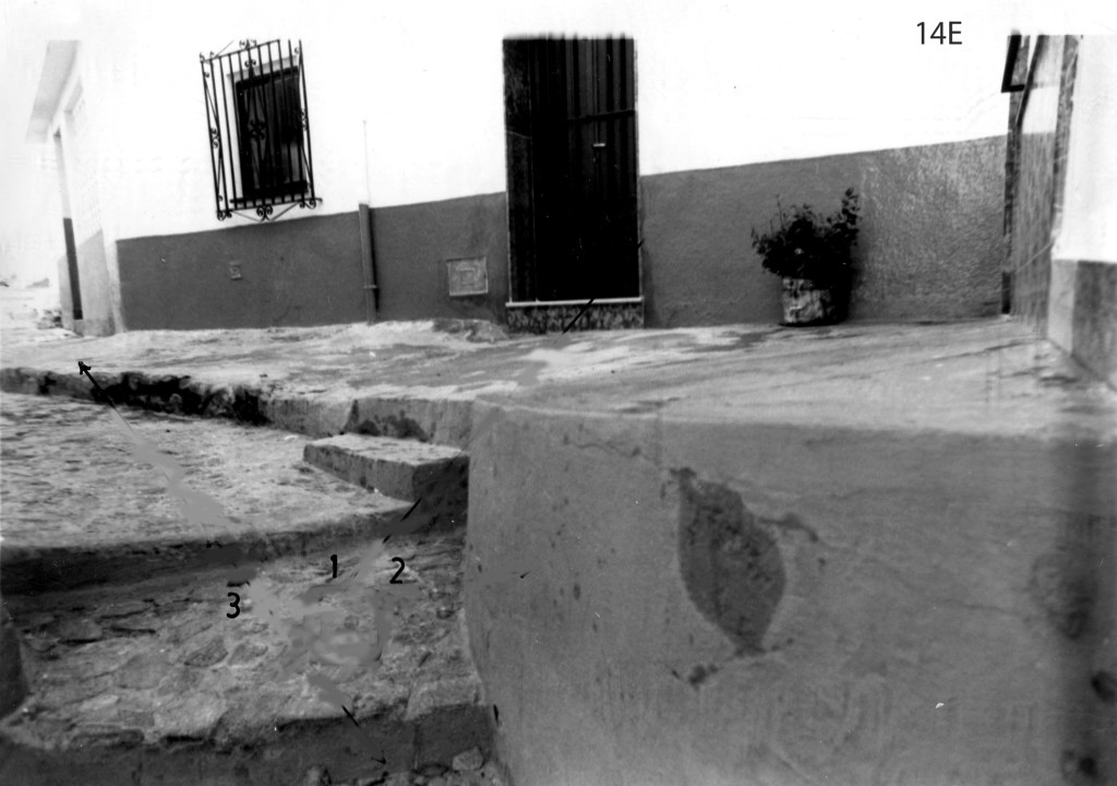 En línea con la trayectoria del acueducto en su entrada a la ciudad, situados frente a lo que fue Puerta de Granada (fot. 21Y), con un fuerte desnivel, ya que entre el punto más bajo, cota 11,70, y el más alto, cota 25,55, no hay más de 40 m lineales. Tales estructuras que aquí se ve, no han podido ser analizadas en sus interiores. Tan sólo nos remitimos a indicar lo que significa para este estudio el trazado de esta calle: fuerte desnivel que debe superar el acueducto para llevar el agua a su destino: el depósito terminal, situado donde ya se ha indicado: solar de la Iglesia Parroquial y zonas anejas.