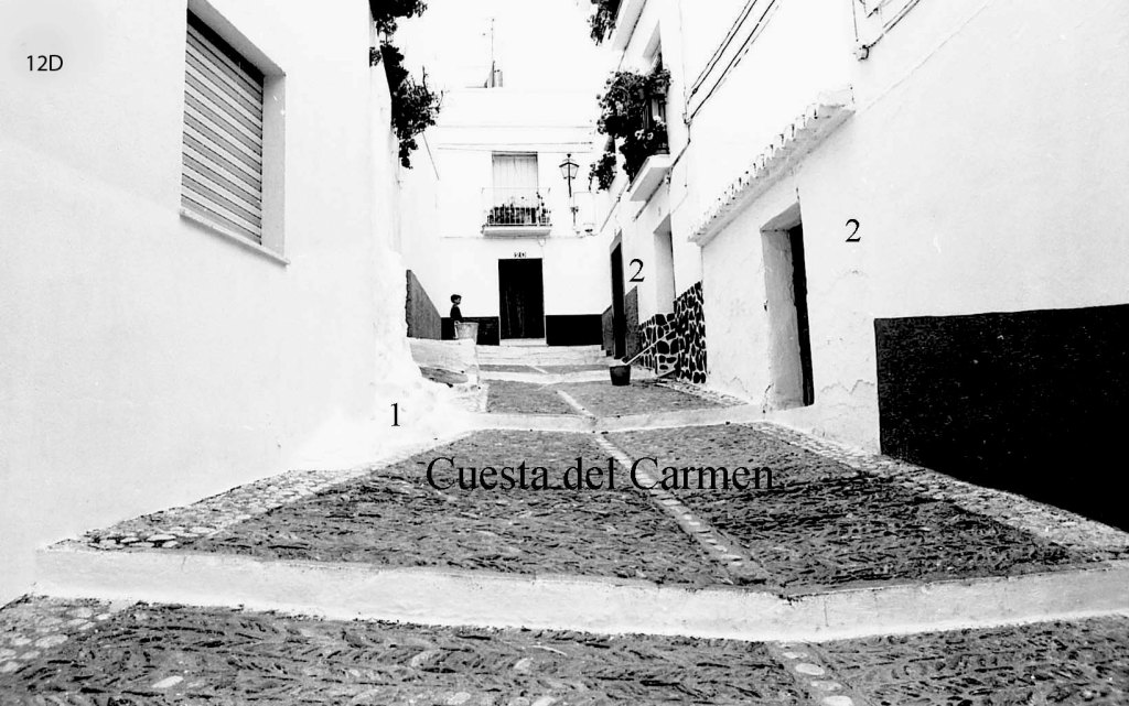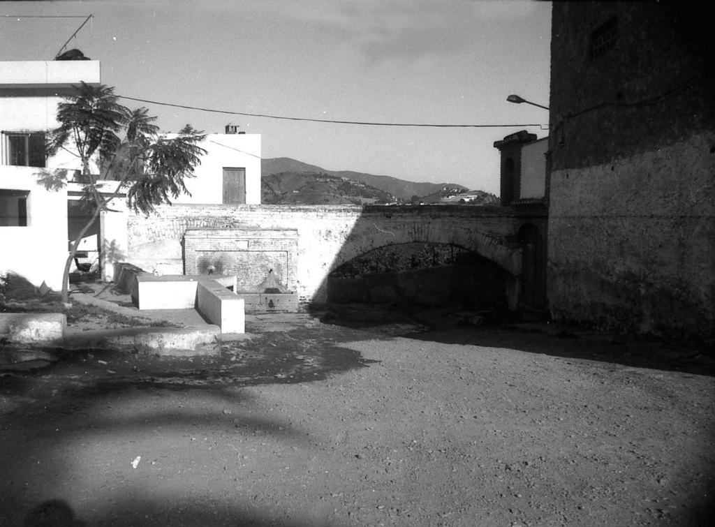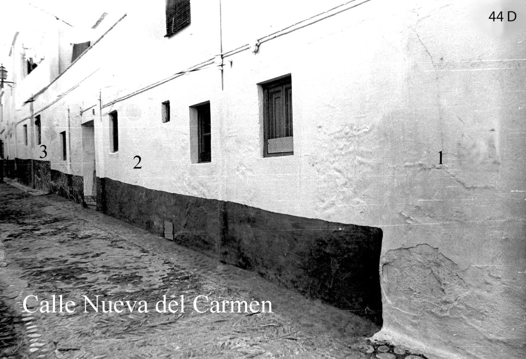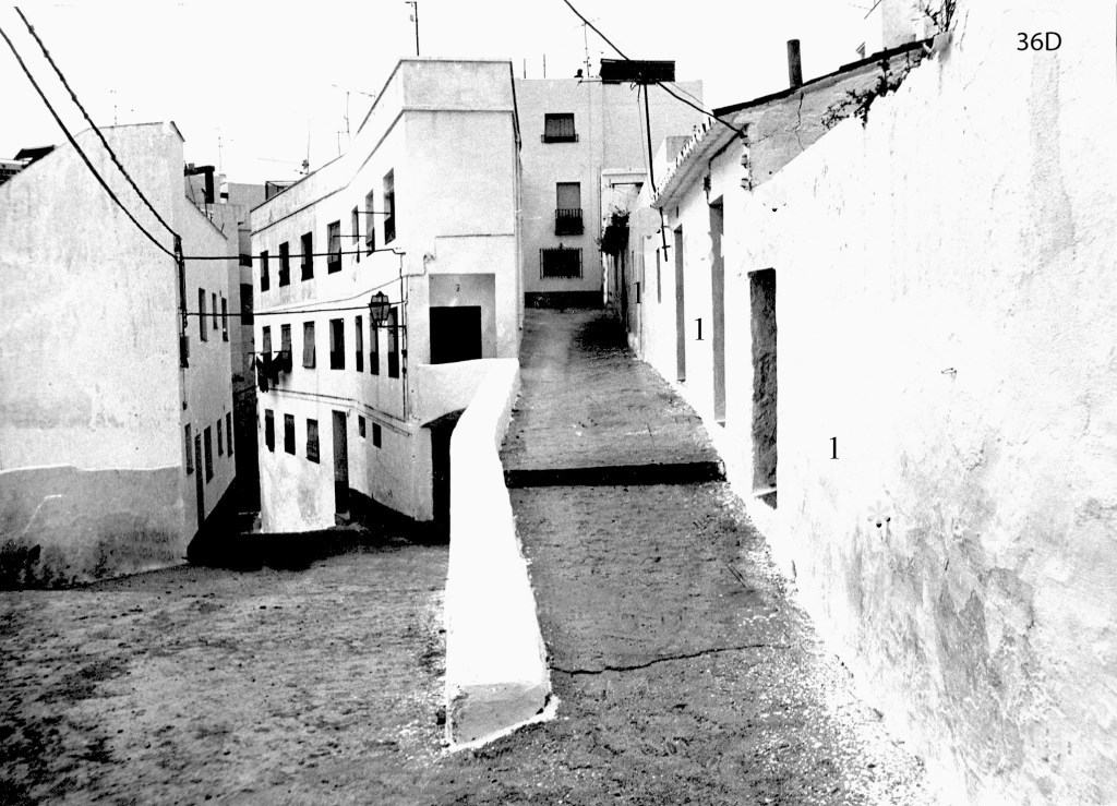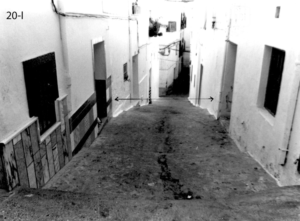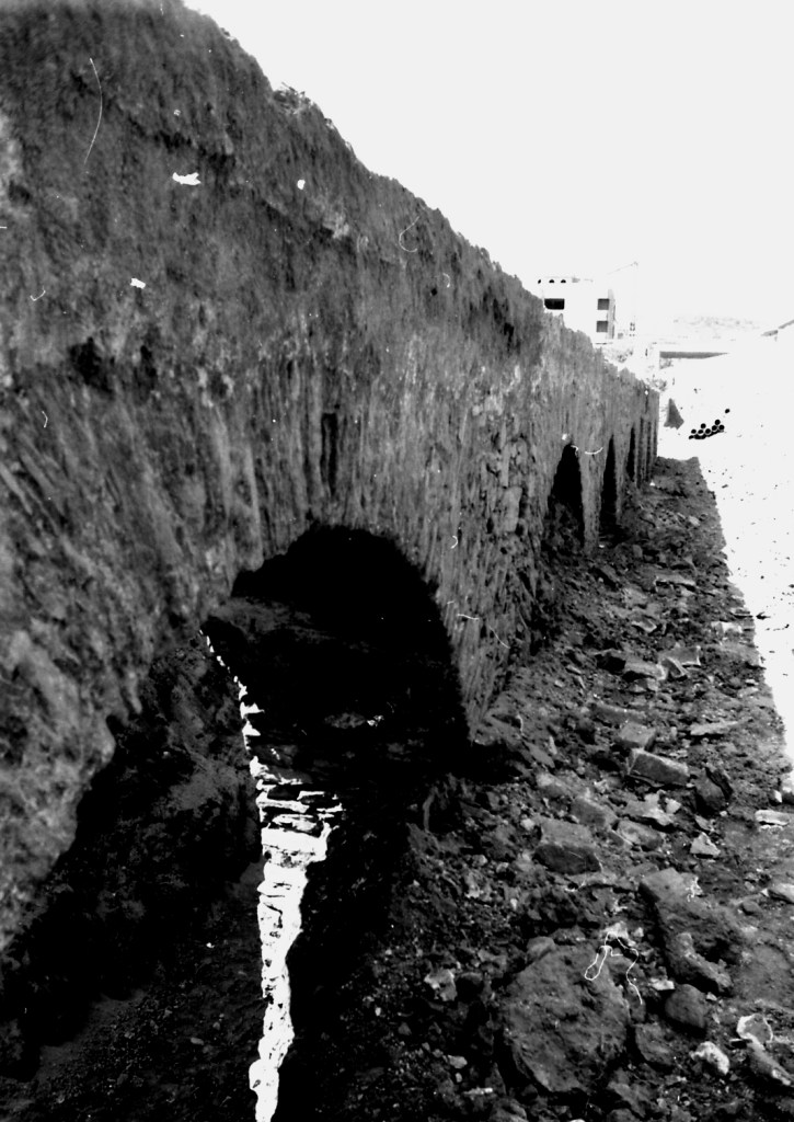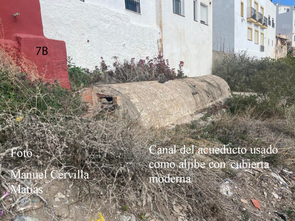 En línea con la trayectoria del acueducto en su entrada a la ciudad, situados frente a lo que fue Puerta de Granada (fot. 21Y), con un fuerte desnivel, ya que entre el punto más bajo, cota 11,70, y el más alto, cota 25,55, no hay más de 40 m lineales. Tales estructuras que aquí se ve, no han podido ser analizadas en sus interiores. Tan sólo nos remitimos a indicar lo que significa para este estudio el trazado de esta calle: fuerte desnivel que debe superar el acueducto para llevar el agua a su destino: el depósito terminal, situado donde ya se ha indicado: solar de la Iglesia Parroquial y zonas anejas.