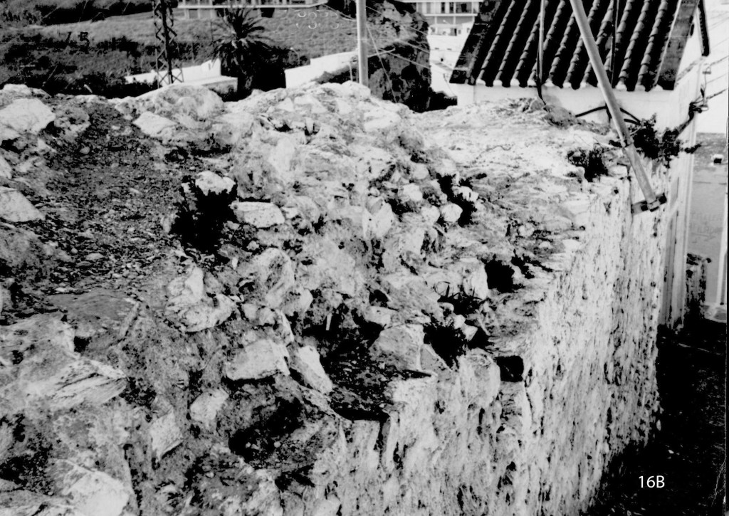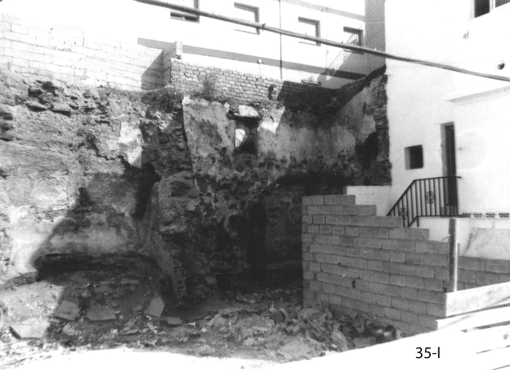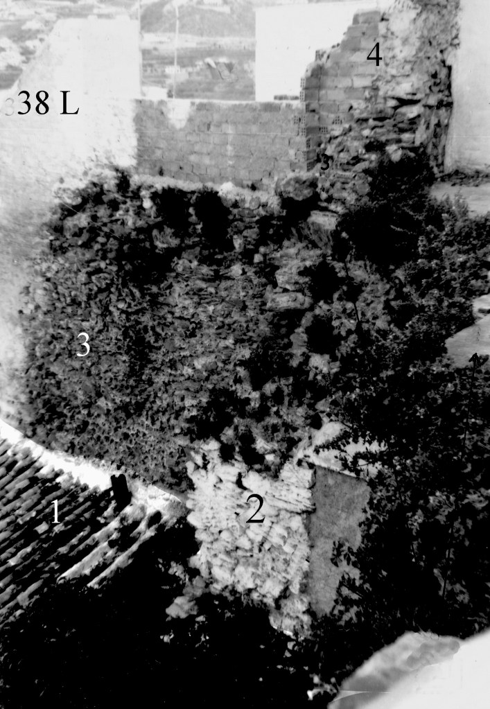 En la foto 1Y, se puede observar todo un lienzo de murallón, cuyo aparejo se ve muy alterado en su aspecto externo. En algunos tramos de su alzado se deja ver la huella del sistema romano de opvs incertvm. Su altura se corresponde con lo habitual dentro de los planes defen-sivos medievales, llegando a alcanzar los 8 m en algunos tramos (fot. 2Y). En el interior de la finca que cierra este murallón existe una nave que, partiendo desde ahí, llega hasta el recinto ocupado por la antigua cárcel. Recientemente se ha comprobado la existencia de dicha nave al realizarse el rebaje de suelo tanto en la construcción del nuevo Ayuntamiento, como en el derribo de una casa cercana y en línea. En las zanjas se vio perfectamente la rotura de dicha con-ducción, que se dirigía a la finca antes citada. Se piensa que se trata de un sistema de llevada de agua entubada a través de las canalizaciones, que se están haciendo patente como una red arterial por toda la ciudad.