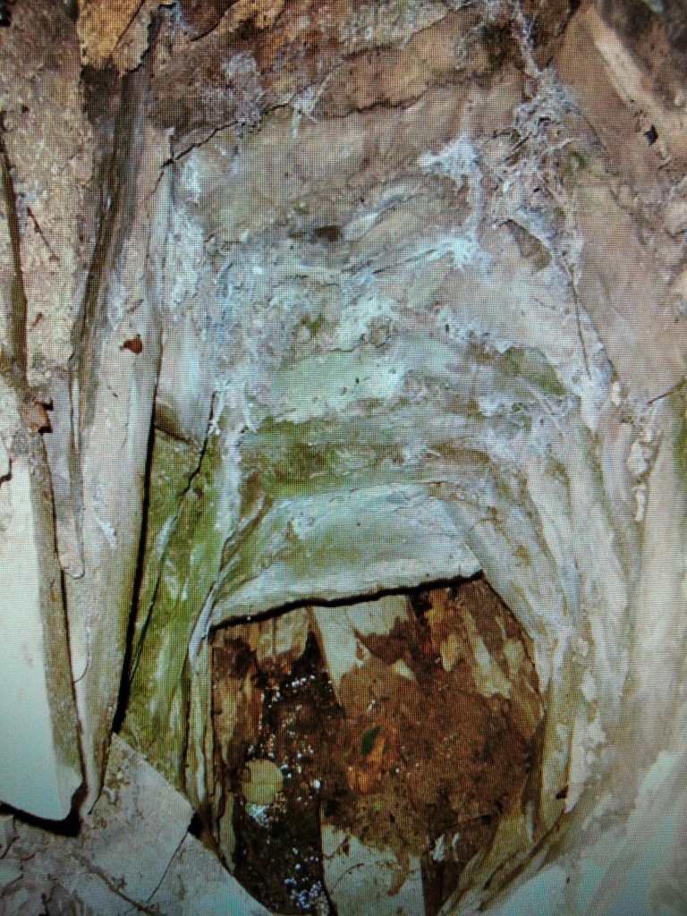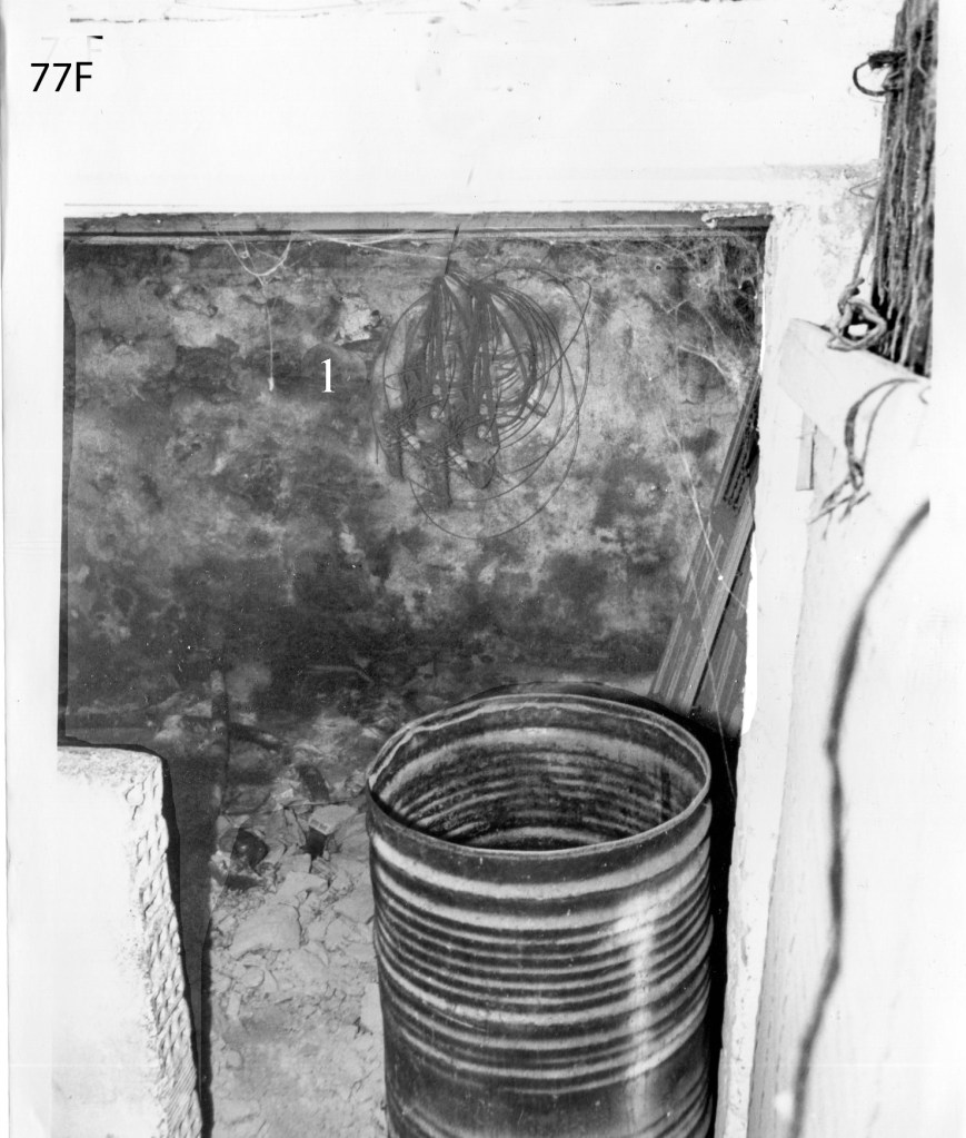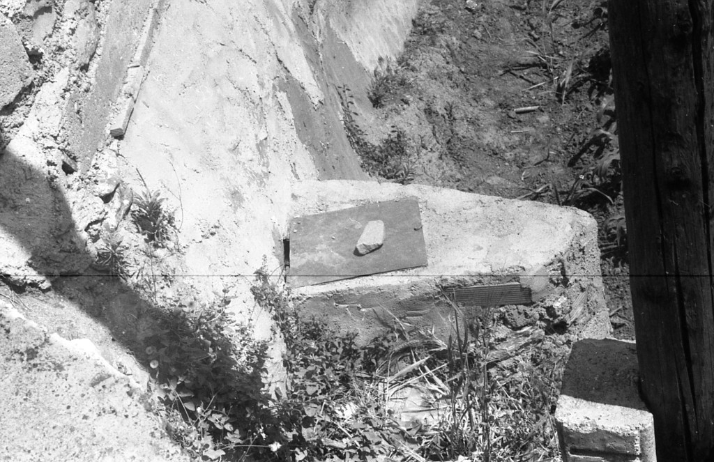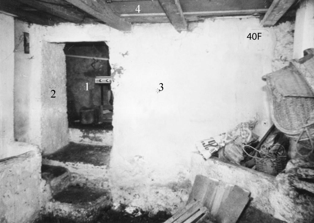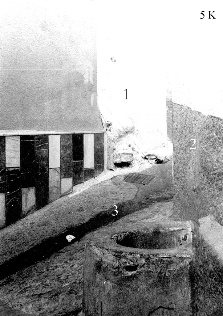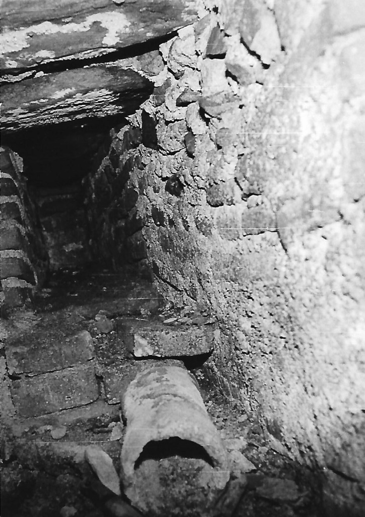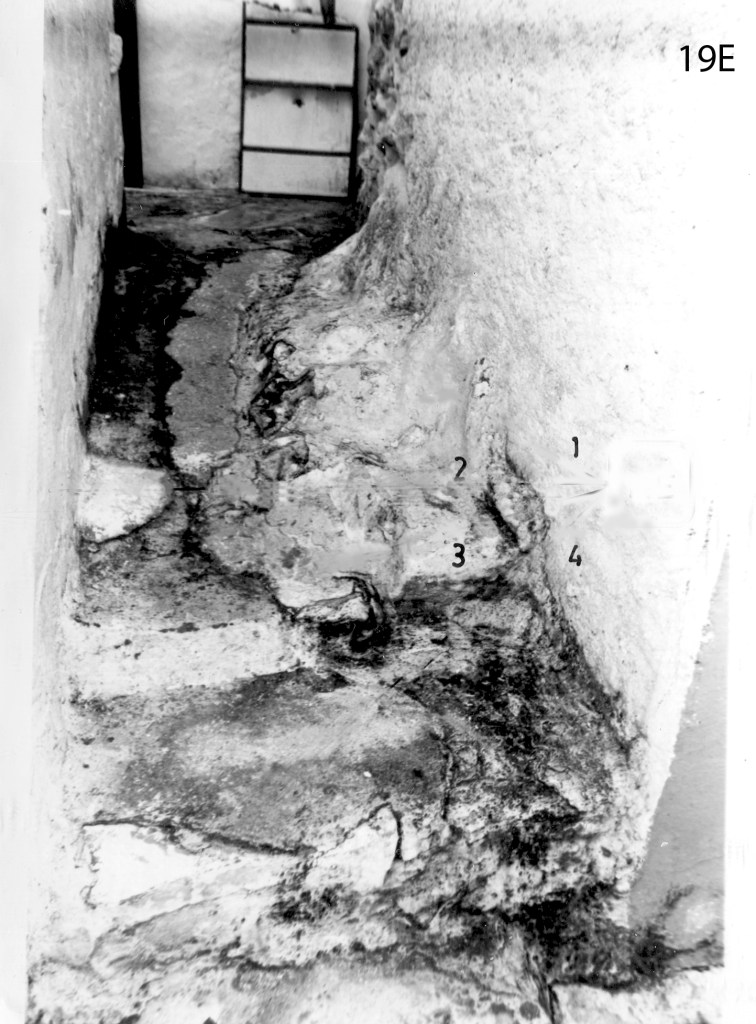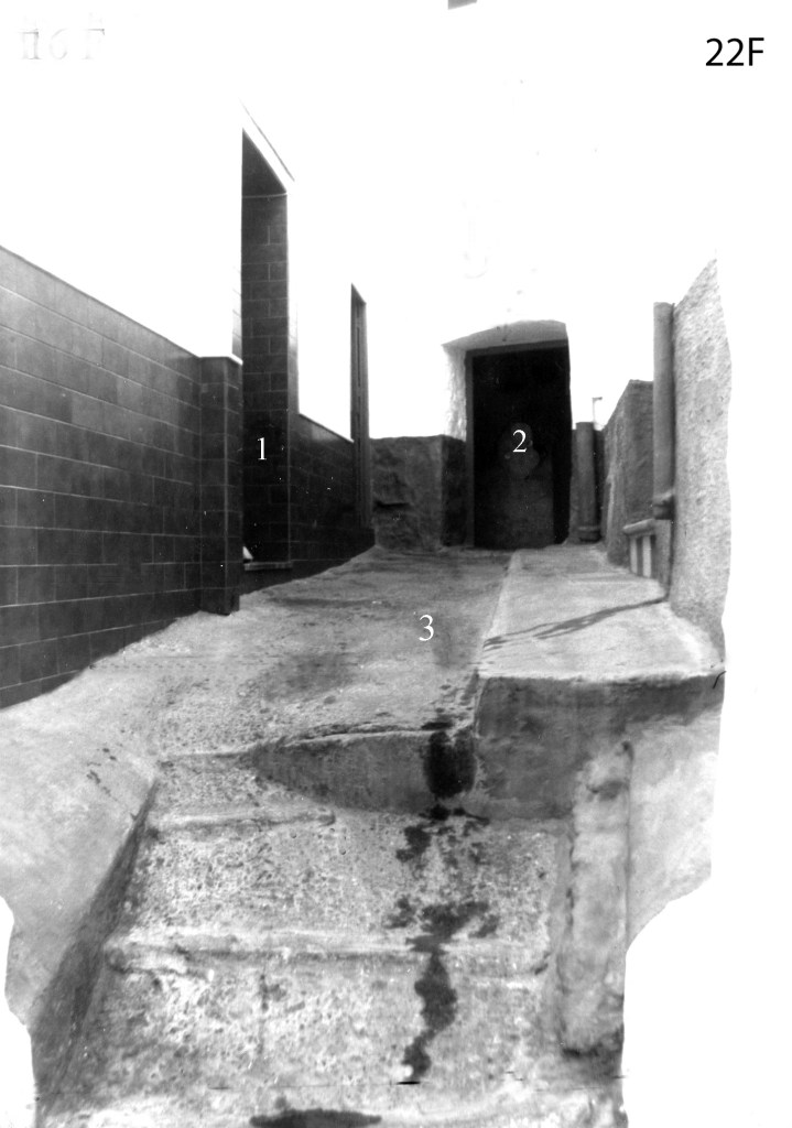 En la fotografía 69Y se ve una pila, revestida de estuco impermeabilizante, una canal de desagüe en el centro, trazado diagonalmente, y escalones laterales, así como la puerta de acceso.