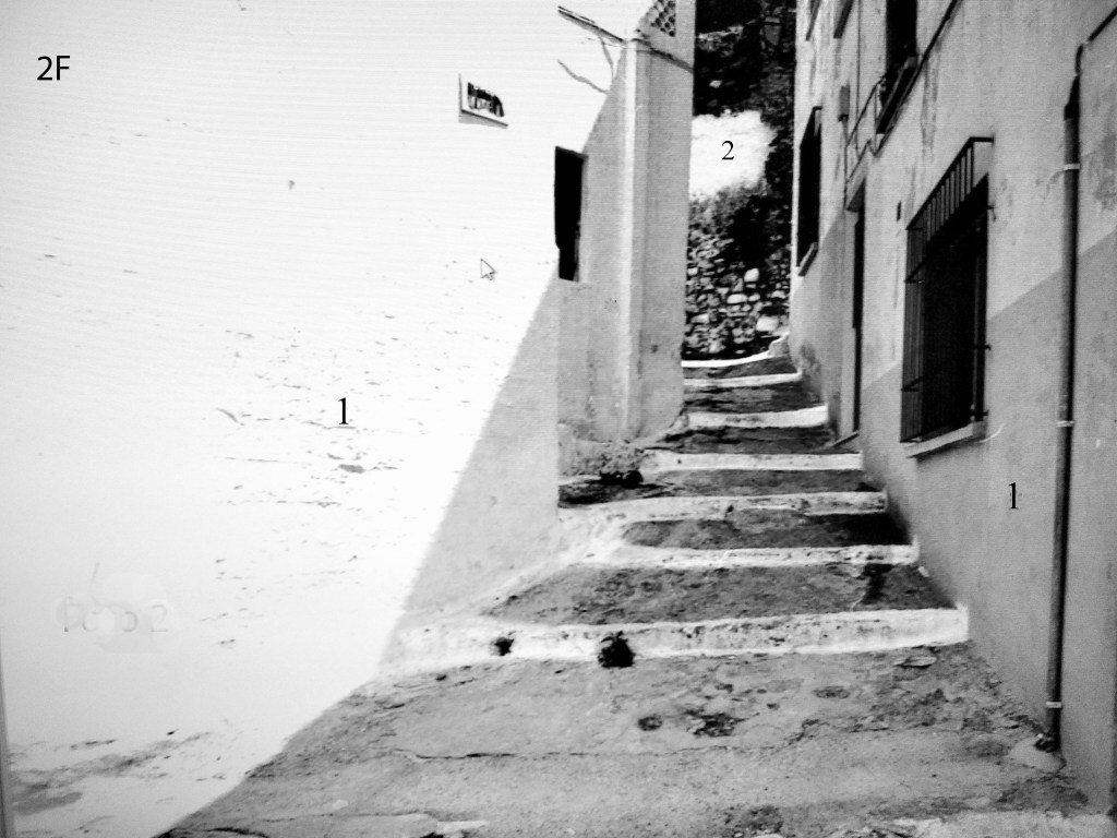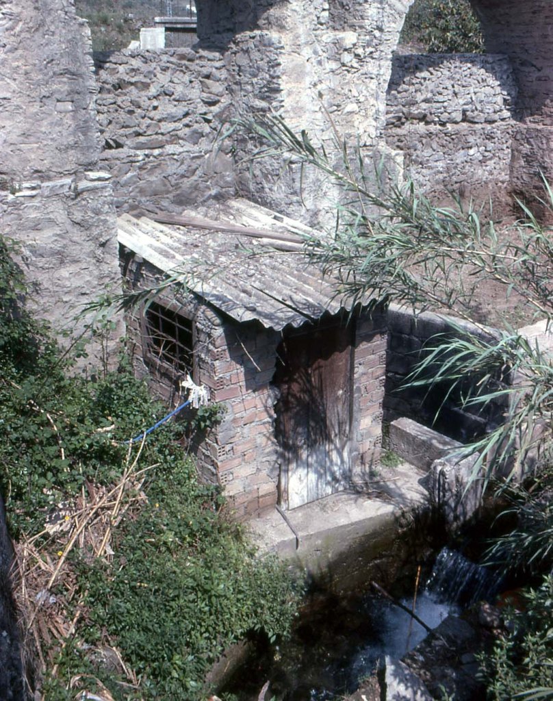 Subiendo por un estrecho paso, situado a mitad de la calle que vemos en 9Y, nos encon-tramos con estructuras de ladrillo, cuya identidad nos resulta difícil de explicar y relacionar con las romanas, pensando, por ello, que son modernas, ya que, al parecer, pertenecen a una anti-gua industria local relativamente moderna (fots. 10Y; 11Y; 12Y). Precisamente hacia la mitad del paramento moderno, que se ve en 11Y, en la parte de sus cimientos, fue donde se pudo apreciar la existencia del canal de conducción de agua, antes citado.