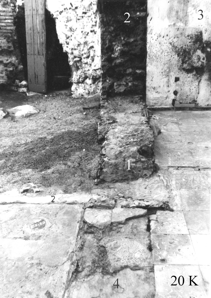 Obsérvese cómo en 38Y,1, la línea de calle rota, está más adentro que los puntos de apo-yo de los pilares contrafuertes del alzado de la Iglesia (fot. 38Y,2). Se piensa, como conclusión de tal pequeño subsector, que el aparejo que se ve y sobre el que se apoya la estructura de la Iglesia, ha tenido unas proporciones superiores a las que se ven y que probablemente están for-mando parte de los cimientos del ábside de la citada edificación.