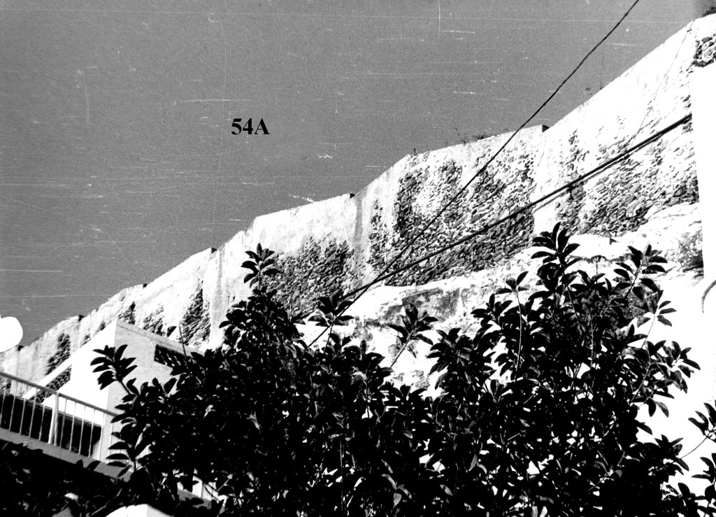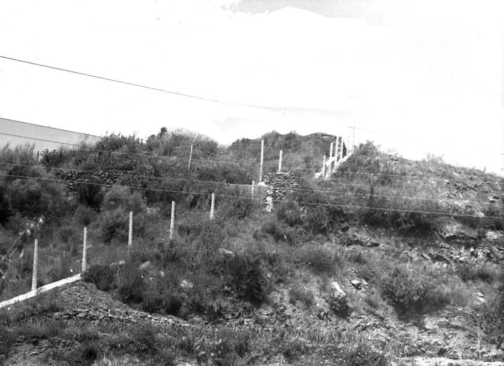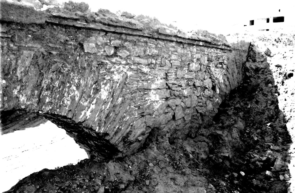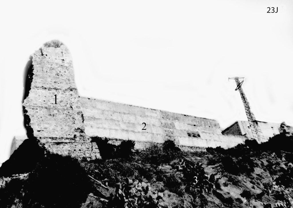 Con motivo del rebaje de terreno practicado para la construcción de la Casa de la Cul-tura, en la parte superior de esta colina norte, sobre la cota 25,50 aproximadamente, ha apareci-do parte de la secuencia de este murallón, cuyo grosor alcanza los 1,40 m. Junto a él, pero sin relación directa, se ha descubierto también una especie de podivm o pilar grueso de opvs cae-menticivm, que nada tiene que ver con la muralla en cuestión, pero sí con la conducción del tra-mo final del acueducto, a su entrada en el complejo, formando parte del sistema de canalización por el que discurriría toda una red entubada, según los cánones del sifón (fots. 24Y; 25Y; 26Y).