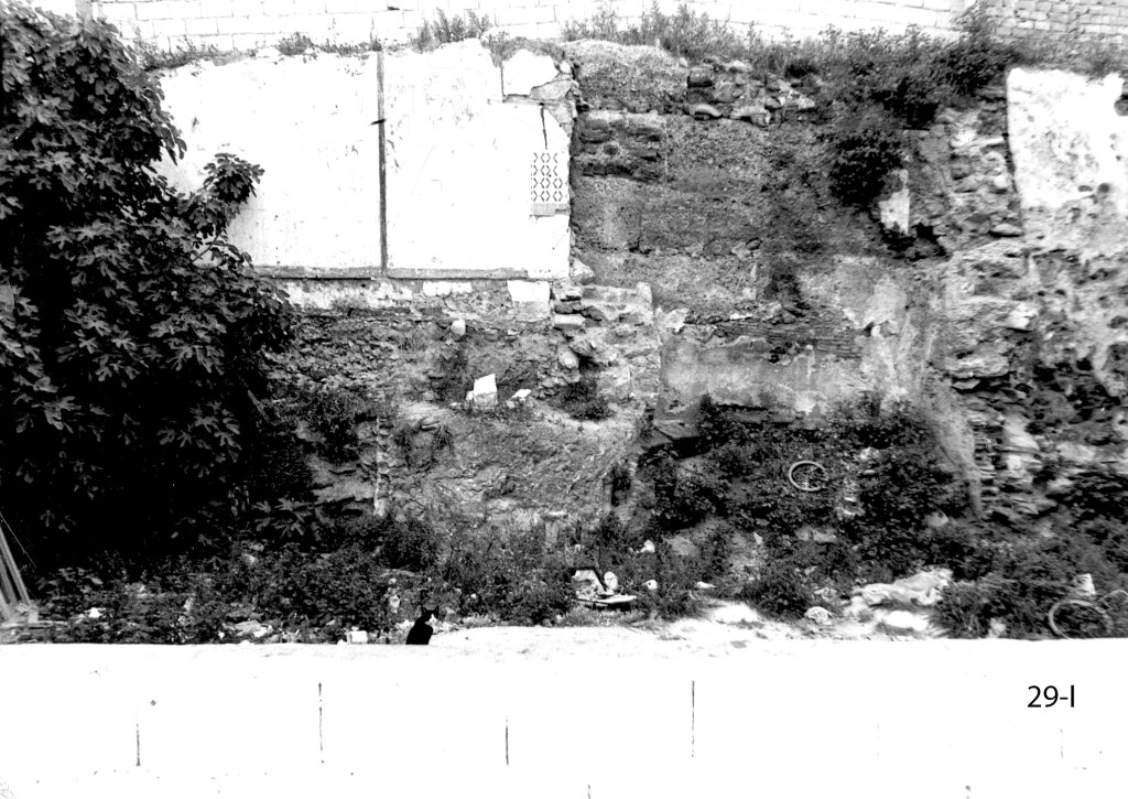 Si nos adentramos por el punto medio de las fachadas que se indican en 29Y, a escasos metros, en un solar rebajado, nos encontramos de nuevo con vestigios de muros modernos apo-yados en clara base romana (fot. 30Y), cuya profundidad no alcanza más del metro y medio (fots. 31Y; 32Y).