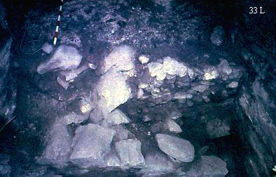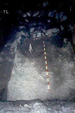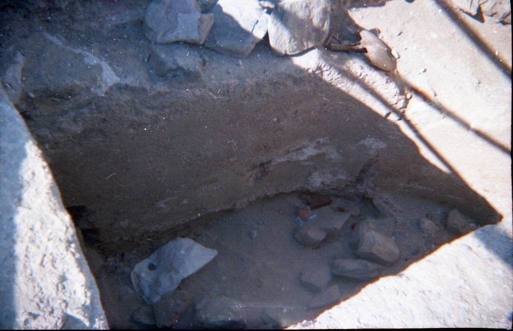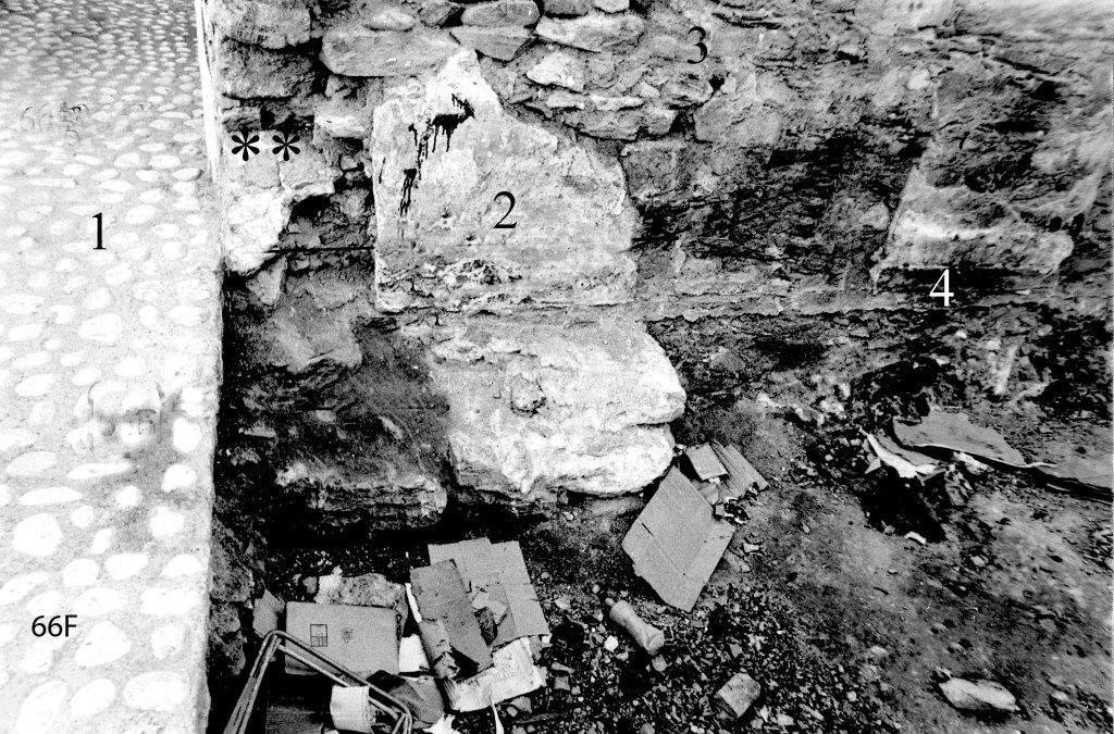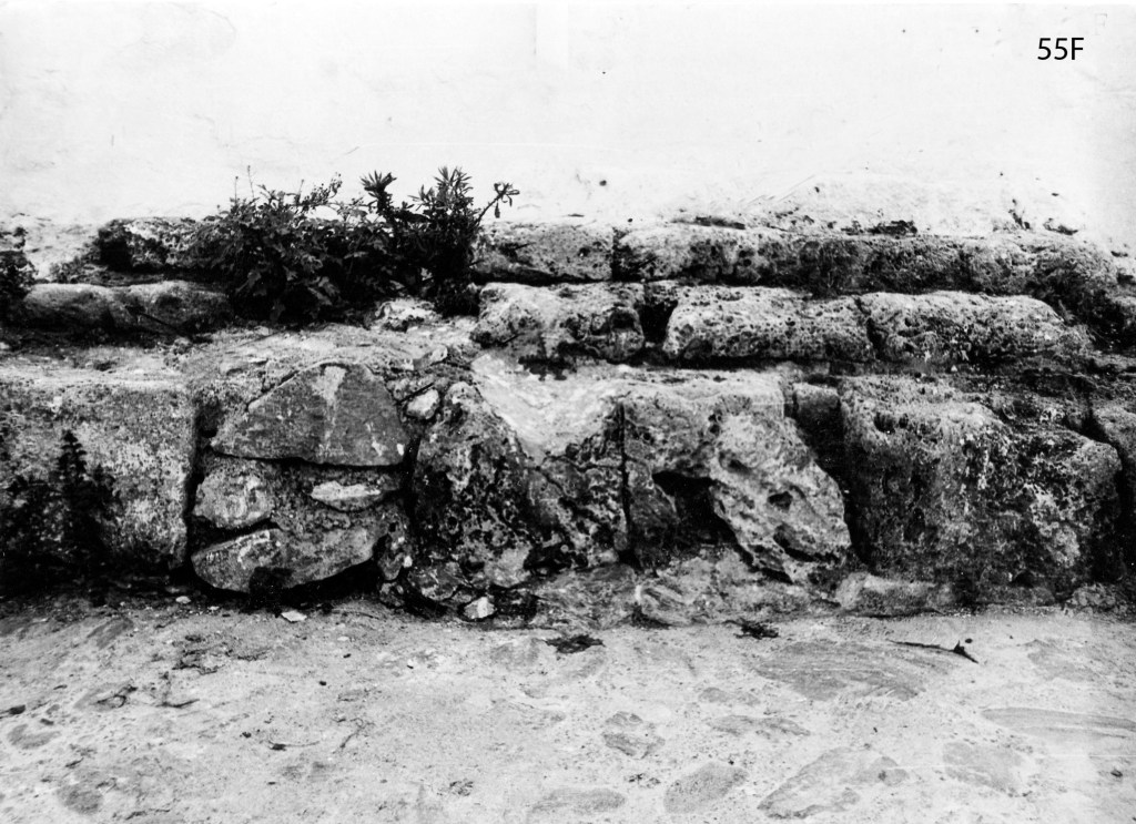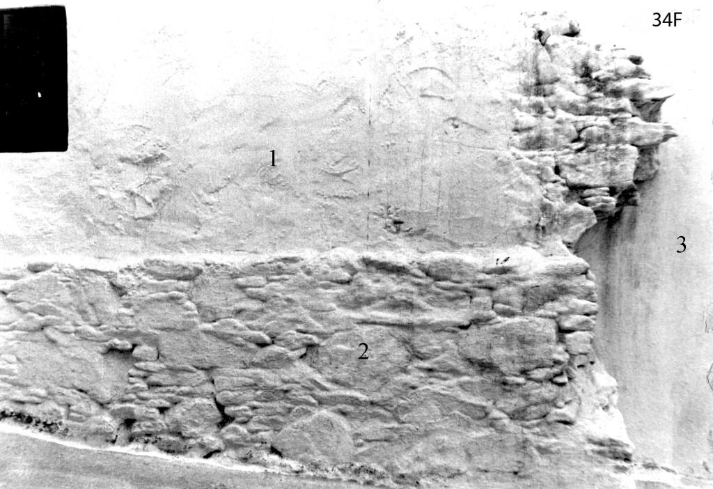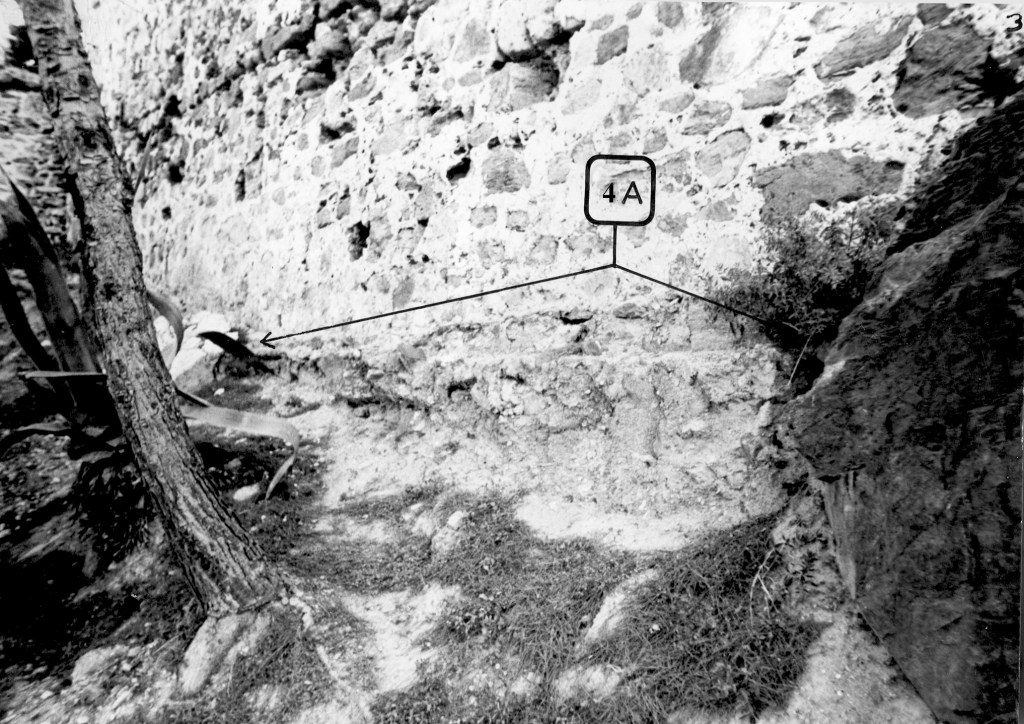 Con toda certeza esta línea de restos de muros en la base de la Iglesia se prolonga hasta el espacio ocupado por el atrio de la misma, en donde se observa su continuidad (fots. 46Y; 47Y; 48Y).