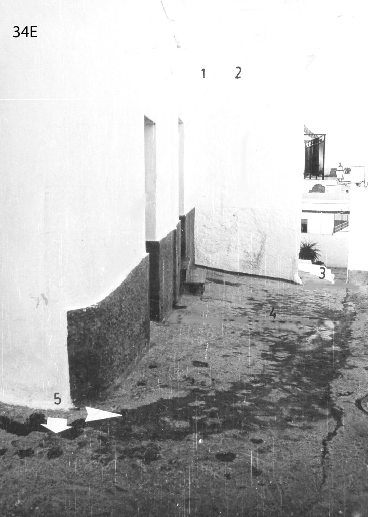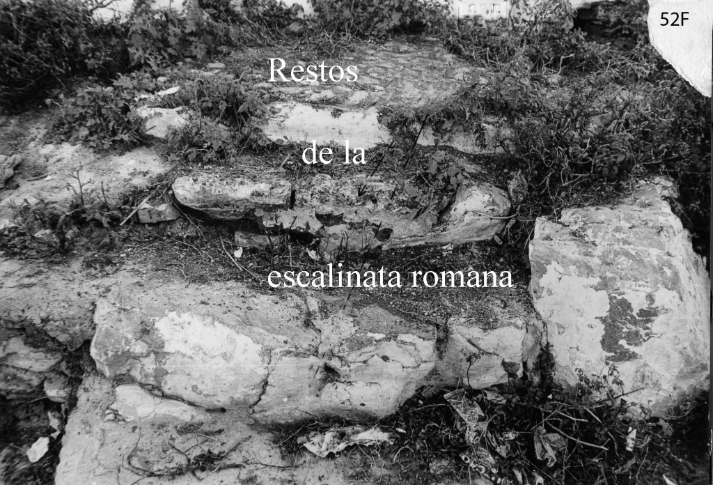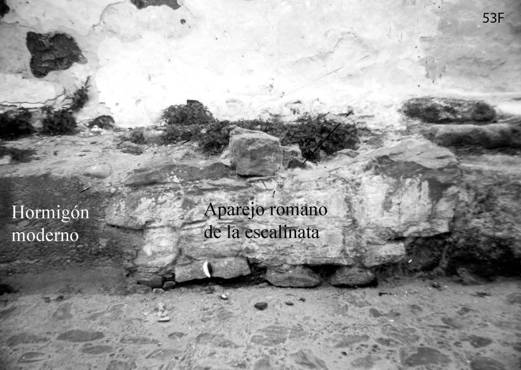 La bajada, del atrio hacia la calle, que sale del mismo, a izquierda, muestra claras seña-les de que se han abierto a golpe de pico, como se comprueba en la foto 49Y. Los muros del citado atrio se montan sobre las viejas estructuras romanas. Pero también insistimos aquí en la posibilidad de que todo cuanto aflora en superficie sea igualmente resto de una plataforma de equilibrio del terreno, ya que no se ha podido demostrar la existencia de ningún resto de para-mento con aparejo externo homogéneo. Tan sólo se pudo, con motivo de la reposición de la actual solería de la Iglesia, ver en el interior de la misma cómo se montaban los paramento mo-dernos sobre los muros romanos existentes debajo, pero la rapidez con que se llevó la ejecución de las obras, no nos permitió poder tomar fotografías de tales detalles, aparte de la negación de una excavación sobre el solar interno.