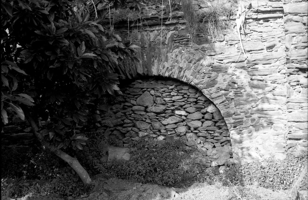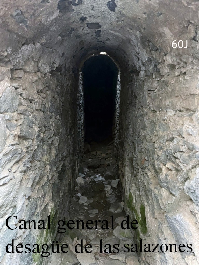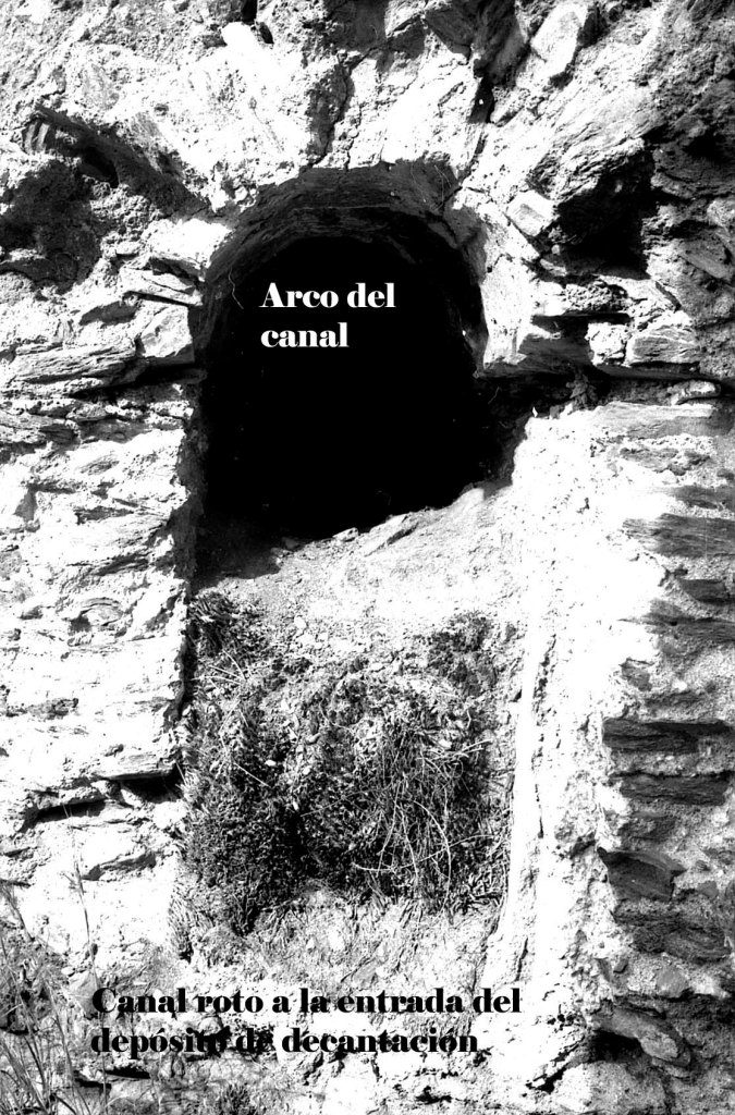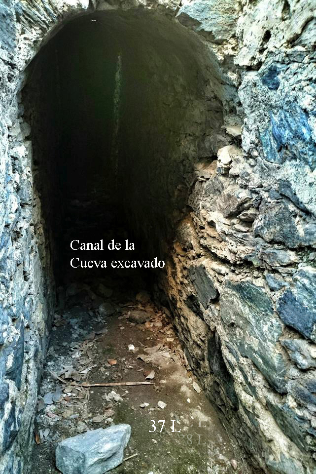 La fotografía 5Y deja ver el interior del canal, con paredes recubiertas de estuco muy deteriorado, y una cubierta formada por lajas de piedra del propio terreno pizarroso. Al fondo de este tramo de canal se ve el paso del conducto que, al parecer, discurre por toda la zona o bajo la calle que pasa por encima. Este es sólo un ramal del canal que se adentra en la citada huerta.