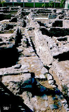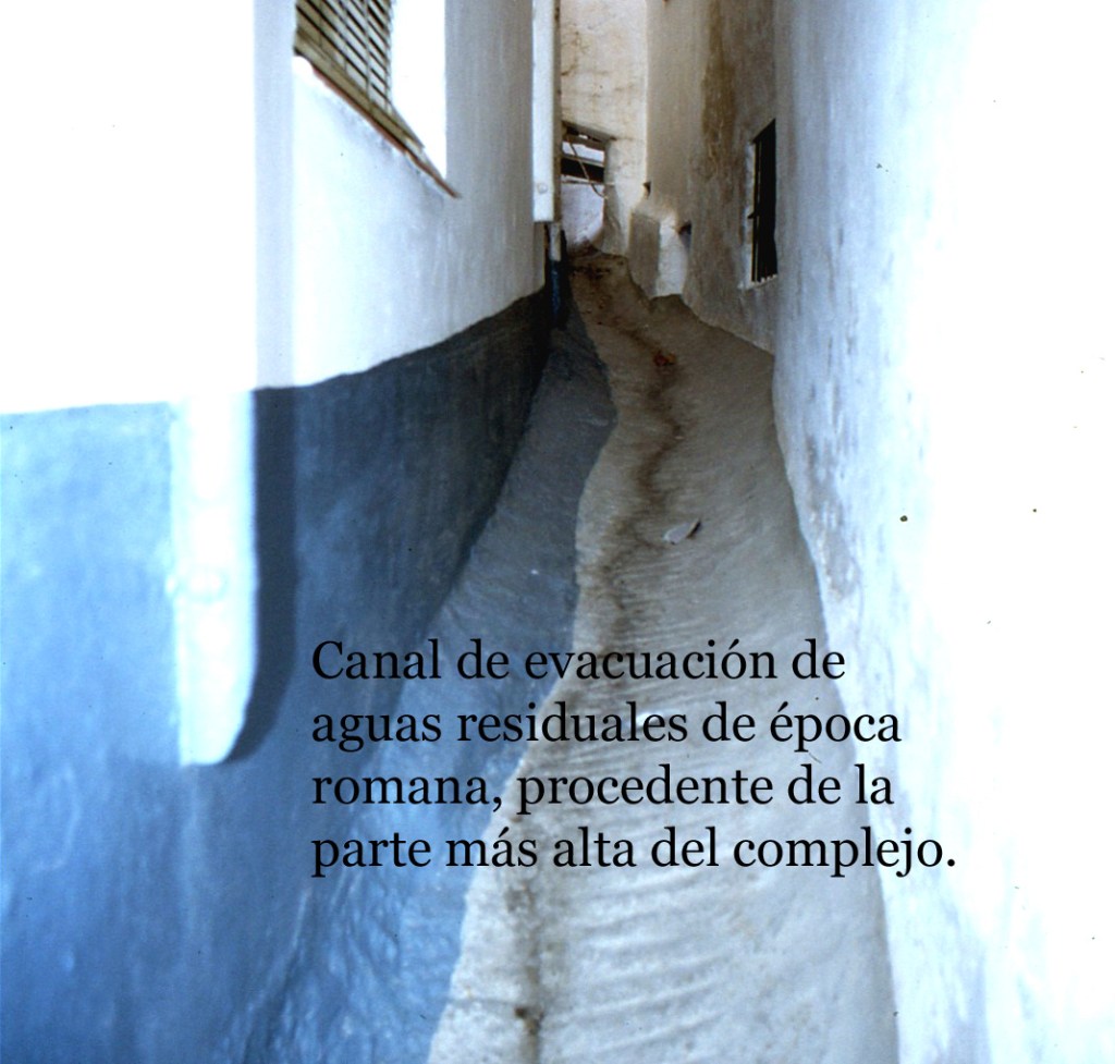 A izquierda del pasillo (fot. 4Z,1) se tiene un sistema canalizado, original, pero reutili-zado hoy también para recoger las aguas de lluvia procedentes de los niveles antes citados (fot. 5Z). En él se puede comprobar que sus muros son originarios; tan sólo han sido retocados enca-lándolos, y discurren paralelos bajo otras estructuras también romanas. Su base es roca madre con un ligero revoque de cemento moderno. Sus medidas: 0,80 m x 0,60 m. Su cubierta ha sido remozada mediante un sistema de bovedillas en todo su trazado, probablemente sustituyendo una antigua cubierta de medio punto o adintelada. Situándonos de nuevo en el tramo inicial, se puede comprobar, dirigiéndonos hacia la cuesta ascendente, la existencia de la reutilización en los paramentos de las casas que nos encontramos (fot. 6Z 1,3). A su vez, se vuelve a utilizar el escalón debido a que en los interiores de estas casas no ha existido pavimento. Por ello, al proceder a su colocación, ha sido necesario rellenar previamente todo el espacio interior hasta nivelar su solería interna con el escalón artificial que se ha colocado en la puerta (fot. 6Z,2). Si nos situamos tras los puntos indicados en 4Z,3 y 5Z, nos encontramos de nuevo con las estructuras romanas reutilizadas que, en su trazado, provienen: unas del sector K (fot. 7Z) y otras, del sector J (fot. 8Z).