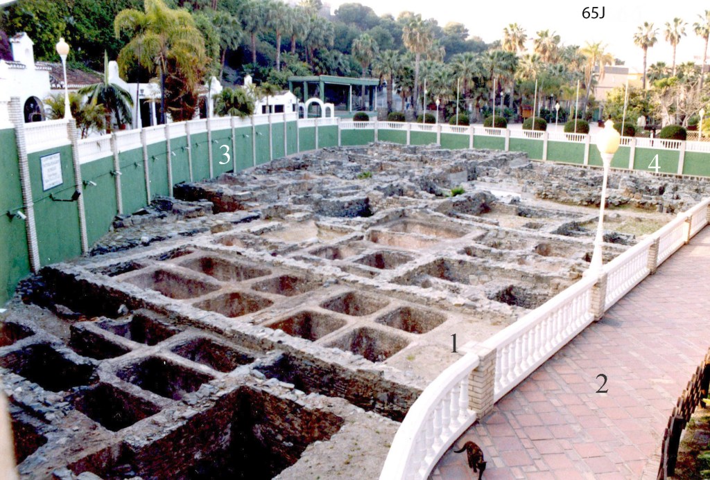 Observando con más detalle el terreno situado detrás de estos murallones, nos encon-tramos con una serie de estructuras romanas que, hasta ahora, habían permanecido sin descu-brir ni identificar. Esta zona marca el comienzo de sistemas de muros romanos enterrados y que forman parte actualmente de la cimentación de las nuevas viviendas. Detrás del muro de con-tención mostrado en la fotografía 3Y, aparece un sistema de canalización de agua, probablemen-te destinado a abastecer los recintos romanos de todo este lienzo, que abarca la totalidad de la avenida de Andalucía hasta las cercanías de la playa.