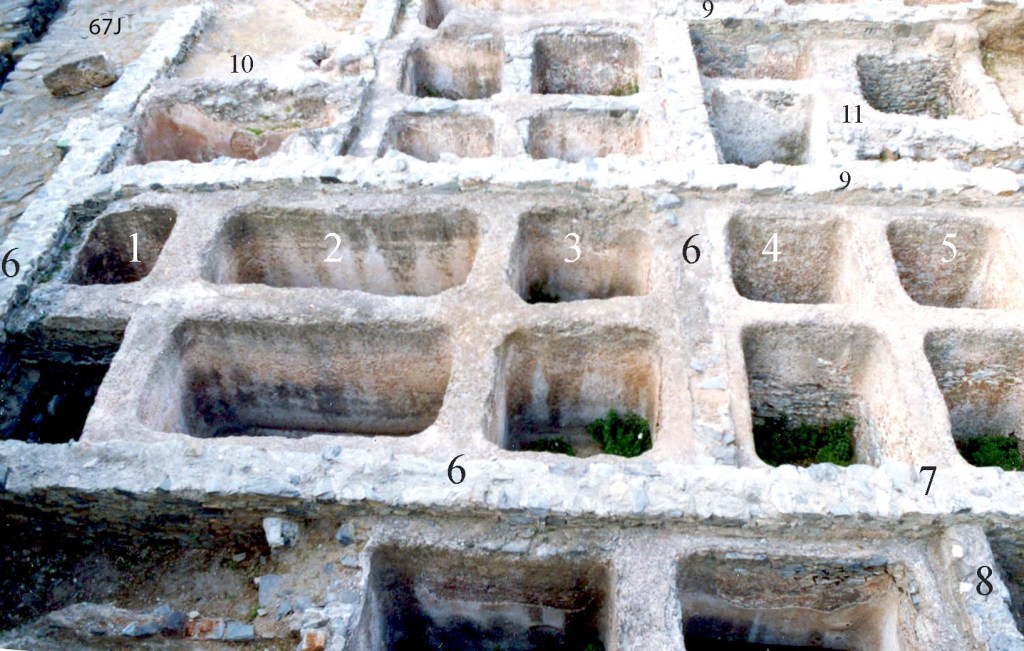 A su vez, bajo el nivel del suelo, se ha detectado la presencia de otros compartimentos, con una probable finalidad similar (fot. 3Z,6), y cuyos muros están construidos con el sistema del opvs incertvm, como el resto de las piezas que aquí se están viendo. Los paramentos, tanto a un lado como a otro del pasillo, mantienen la misma técnica constructiva y las mismas propor-ciones.