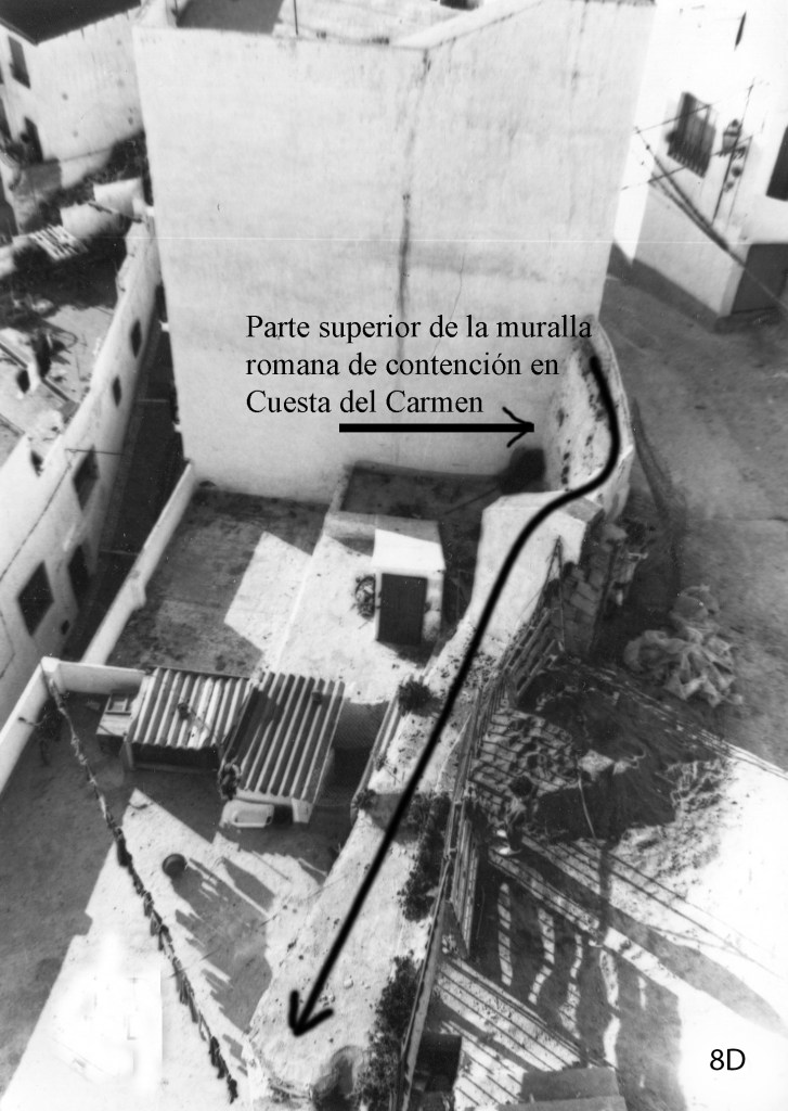De esta forma, en la panorámica tomada en la placeta de la foto 1Z, se puede ver cómo el paramento de la izquierda o alzado general de las casas situadas en la misma dirección, se encuentran superpuestas a toda una base formada por un muro romano bien comprobado. Dicho muro debió alinearse hasta cerrar, al fondo de la imagen, con las estructuras romanas que lindan con el Majuelo, área situada detrás del paramento y espacios inferiores de fondo.