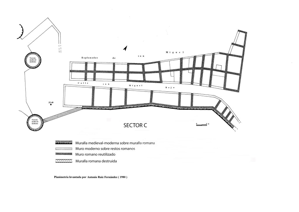 Iniciamos el recorrido descriptivo comenzando por el murallón de circunvalación, en el que nos cabe la posibilidad de admitir que parte de su alzado, puede pertenecer, como elemen-tos reutilizados, a las estructuras de la factoría de salazones que se encuentran enterradas, a cierta profundidad, a lo largo de todo este subsector y contando con los elementos aflorados junto al Paseo del Altillo. De esta situación se tiene el testimonio de los resistentes muros apa-recidos con motivo del rebaje de terreno, efectuado para sentar las zapatas de toda la construc-ción moderna que aquí se ha realizado recientemente.