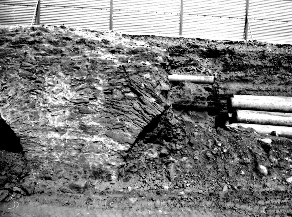 En la zona noroeste de la ciudad, a 20 m de la línea de muralla medieval, se ha podido detectar, en un rebaje, la existencia de una secuencia de muro romano (fot. 58Y). Se trata de una estructura de características similares a las antes vistas, pero bastante más deterioradas, debido a las construcciones que ha debido soportar encima (fot. 59Y).