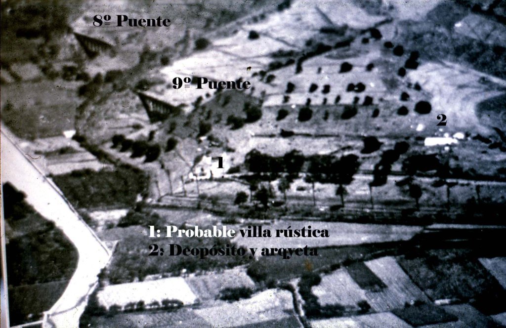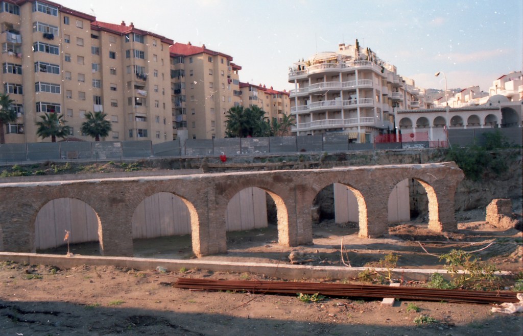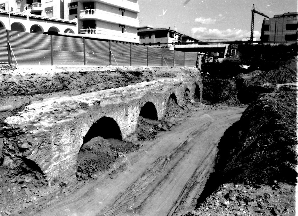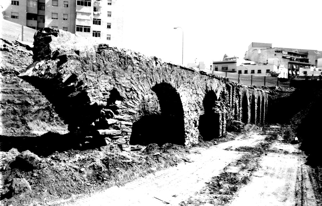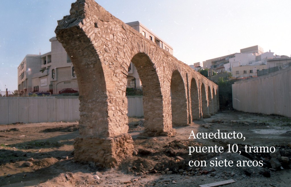 La zona recientemente descubierta en los aledaños del acueducto a la entrada de la ciudad, ha dado como resultado el descubrimiento de la mayor parte de este tramo de arcos del mismo, a la vez que un complejo de estructuras que conforman unas termas romanas. Se podría haber recuperado la totalidad de este tramo, pero la apresurada excavación del acueducto per-mitió que cuatro de sus arcos se derrumbaran y se perdieran, porque sus restos rotos fueron tirados como escombros en vez de haber intentado su reimplantación y restauración, tal como se hizo en los Arcos de Torrecuevas, tiempos atrás. La fotografía 62Y nos muestra el tramo más extenso a la entrada de la ciudad. En uno de sus extremos se ve el arco partido. En la fotografía 63Y se ven los puntos de arranque de los arcos perdidos entre los dos tramos del puente del acueducto. A su derecha se dejan ver los restos de las termas que, a continuación se detallarán.