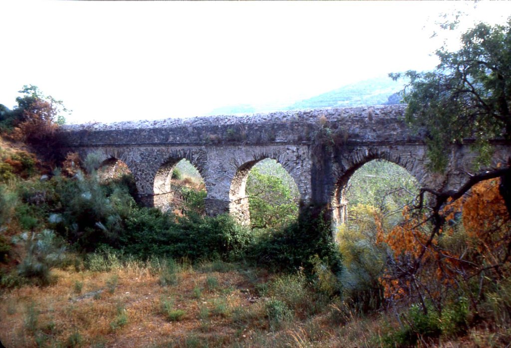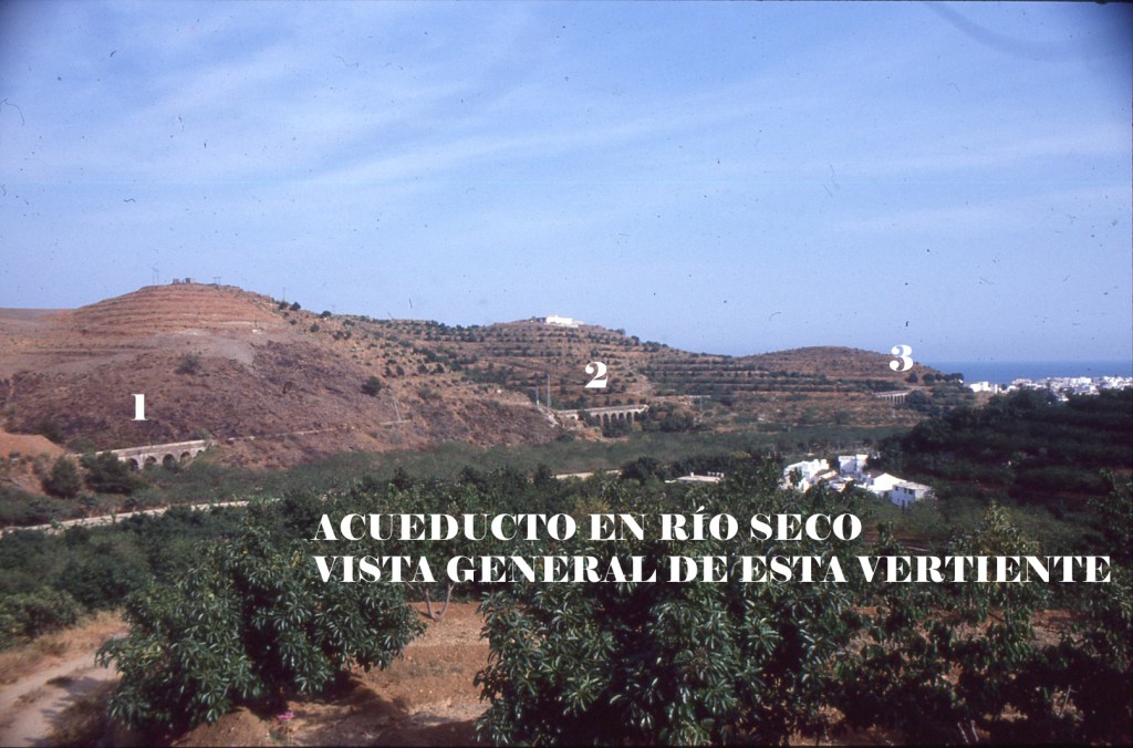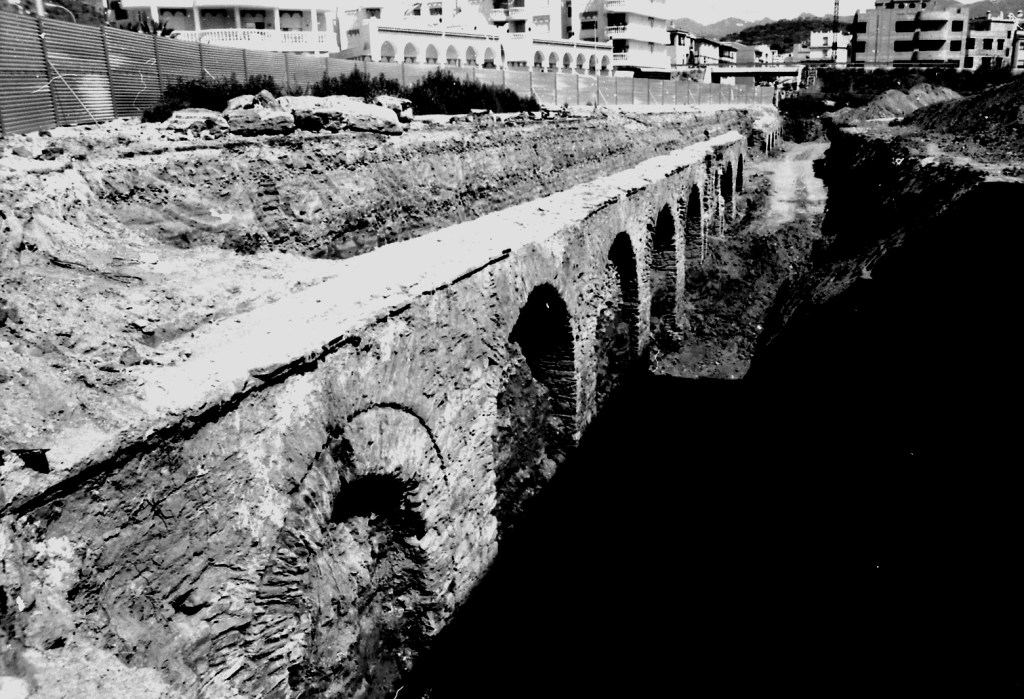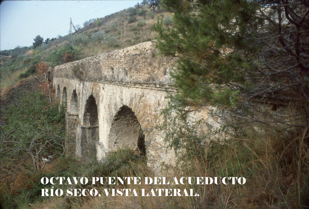 La zona recientemente descubierta en los aledaños del acueducto a la entrada de la ciudad, ha dado como resultado el descubrimiento de la mayor parte de este tramo de arcos del mismo, a la vez que un complejo de estructuras que conforman unas termas romanas. Se podría haber recuperado la totalidad de este tramo, pero la apresurada excavación del acueducto per-mitió que cuatro de sus arcos se derrumbaran y se perdieran, porque sus restos rotos fueron tirados como escombros en vez de haber intentado su reimplantación y restauración, tal como se hizo en los Arcos de Torrecuevas, tiempos atrás. La fotografía 62Y nos muestra el tramo más extenso a la entrada de la ciudad. En uno de sus extremos se ve el arco partido. En la fotografía 63Y se ven los puntos de arranque de los arcos perdidos entre los dos tramos del puente del acueducto. A su derecha se dejan ver los restos de las termas que, a continuación se detallarán.