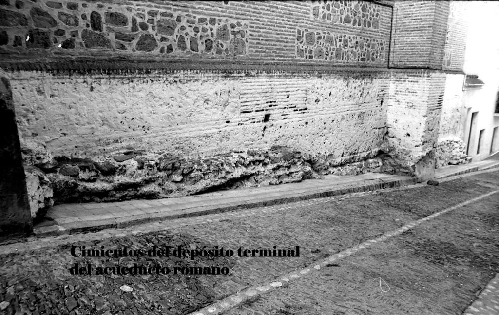 Cambiando de escenario arqueológico, iniciamos la descripción del área del depósito terminal del acueducto, en el interior de la ciudad y sobre la colina en que se encontraba empla-zado, para analizar los restos que nos han quedado del mismo. La vertiente norte de la Iglesia (fot. 37Y) nos muestra una panorámica con vestigios atribuibles tanto a la torre de descarga como a los componentes de base que conforman el depósito de agua situado en la base de la misma Iglesia. Es muy difícil precisar el grosor de los muros, pero teniendo en cuenta que coin-ciden con lo que es el alzado de la Iglesia, que sitúa sus muros sobre la estructura base del depó-sito romano, se cree que puede llegar a alcanzar algo más de los 1,45 m, aunque en la parte que da a la calle no podemos precisarlo debido a que se encuentra muy alterado. Pero fijándonos bien en esta vertiente y en el muro de base en concreto, se ha llegado a pensar que lo que se ve no son restos de muros exactamente sino parte de una plataforma de equilibrio del terreno, dada la fuerte pendiente que se puede ver en la misma calle, a la que lógicamente se considera artificial.